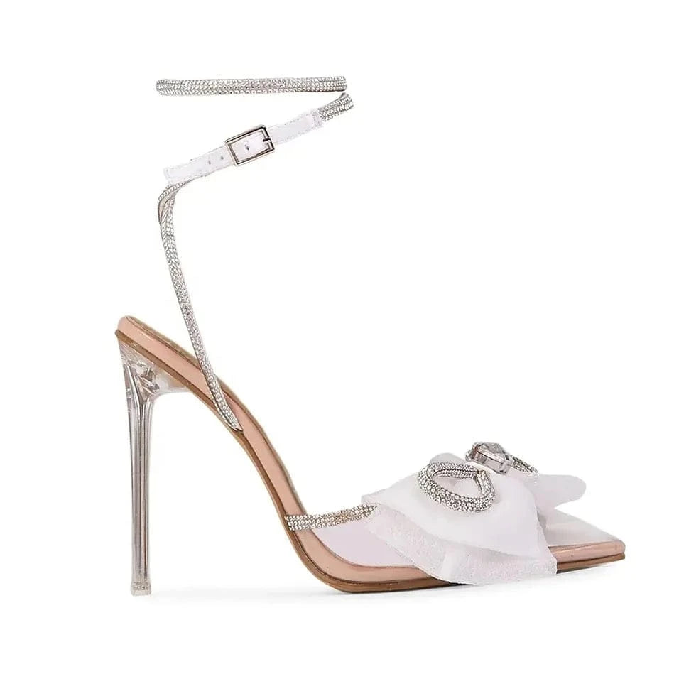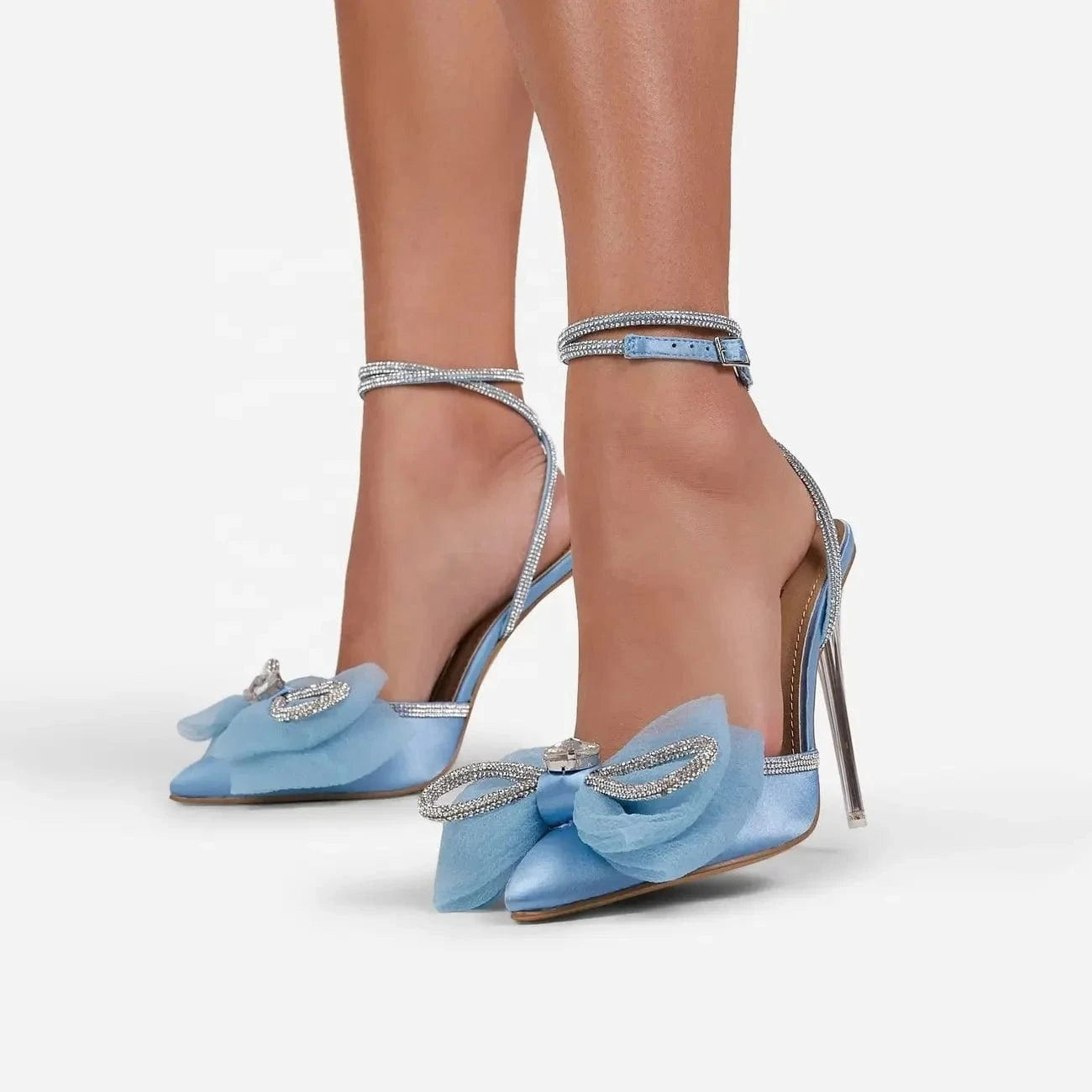 Wholesale New Design Women Heels Shoes Chriselle Bow Detail Diamante Lace Up Clear Perspex Heel In Blue Satin Women Heels Pumps