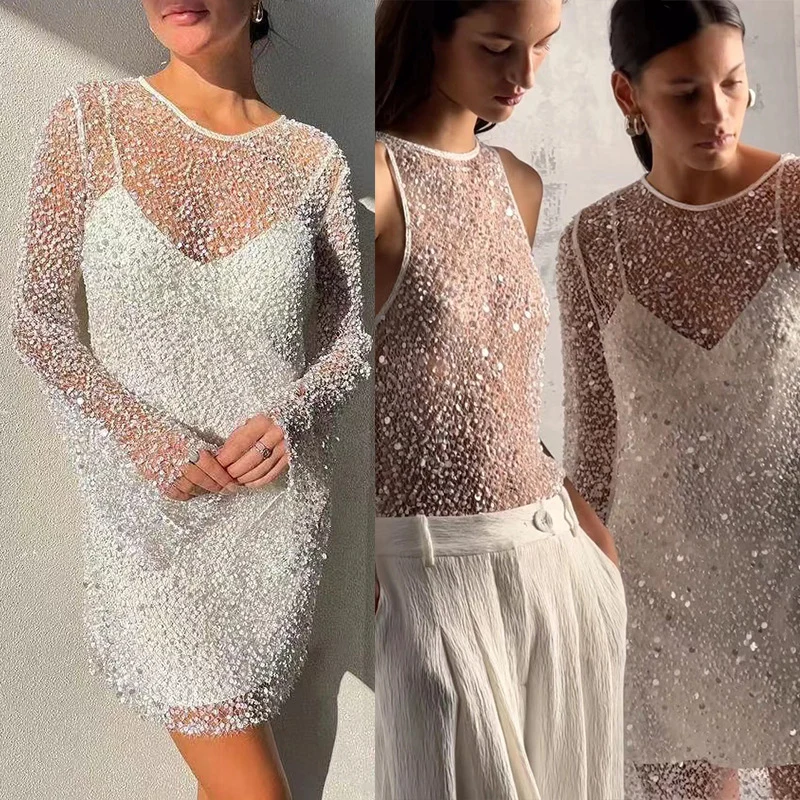 Women Elegant Splicing Solid Versatile Dress Chic O-Neck Sequins Hollow Dress Fashion Suspender Party Temperament Mini Dresses