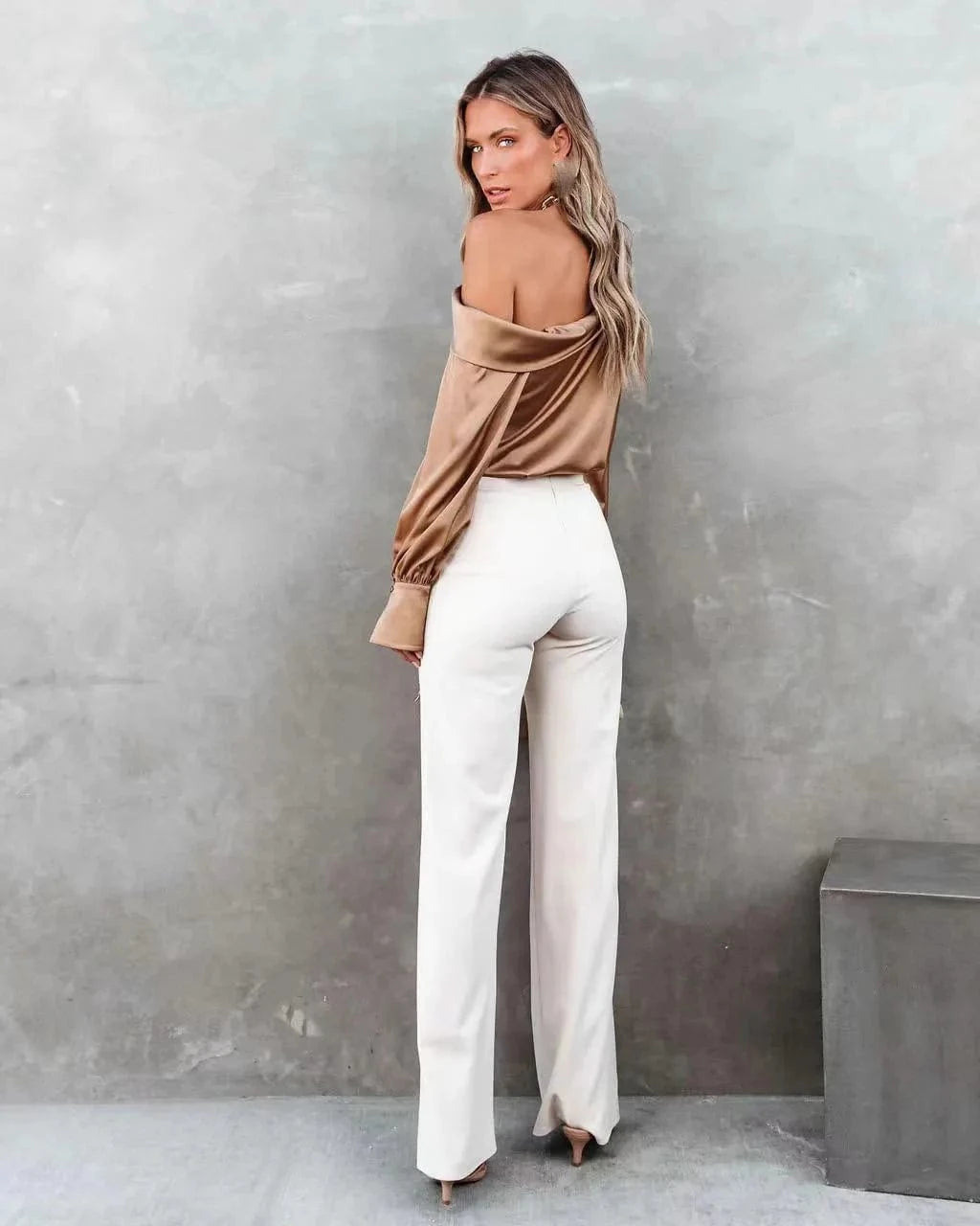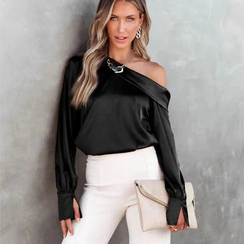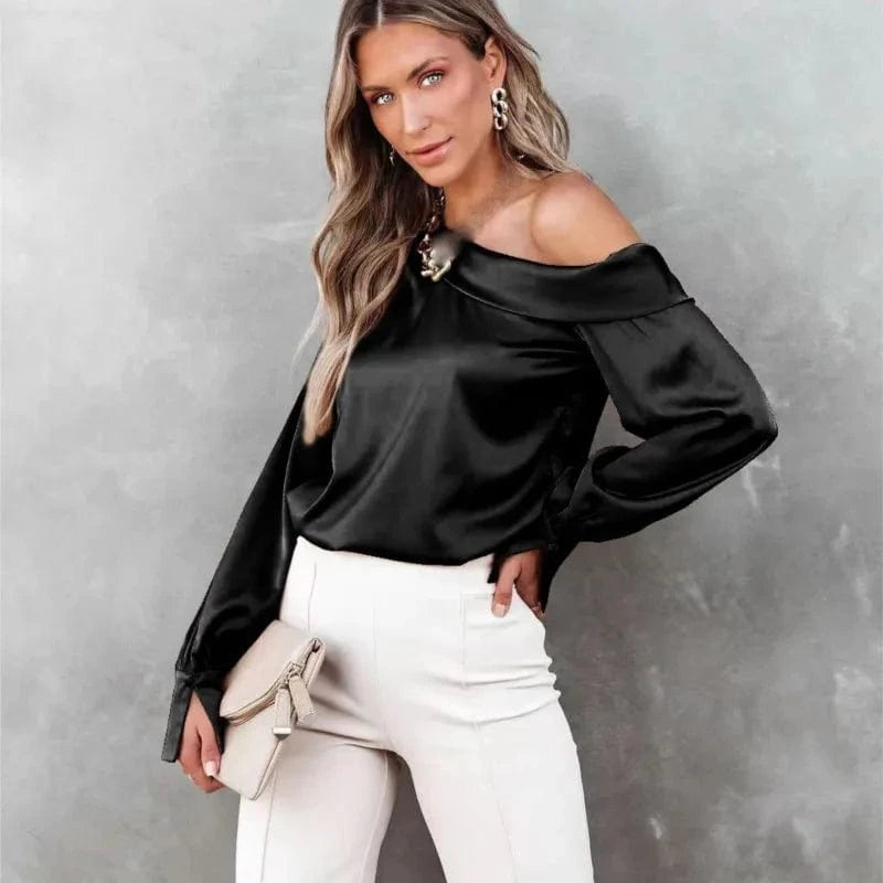 Women Fashion Sexy Slash Neck Satin Blouse Solid Color Long Sleeve Off Shoulder Office Shirt Lady Casual Loose Blouse Tops
