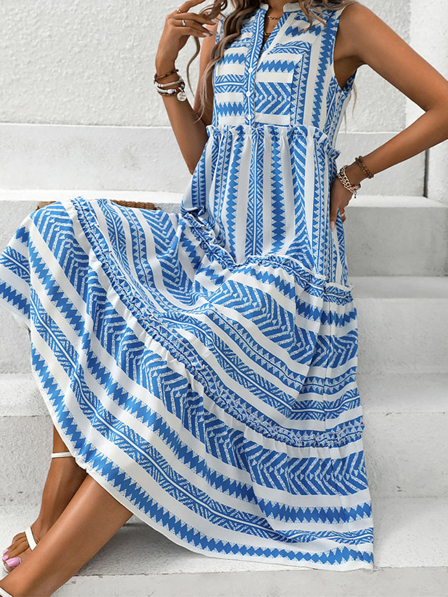Vintage geometric print, button detail, split v-neck, ruffles, sleeveless; Casual dresses for women; Ankle length design, easily show your charming curves, perfect addition to your closet