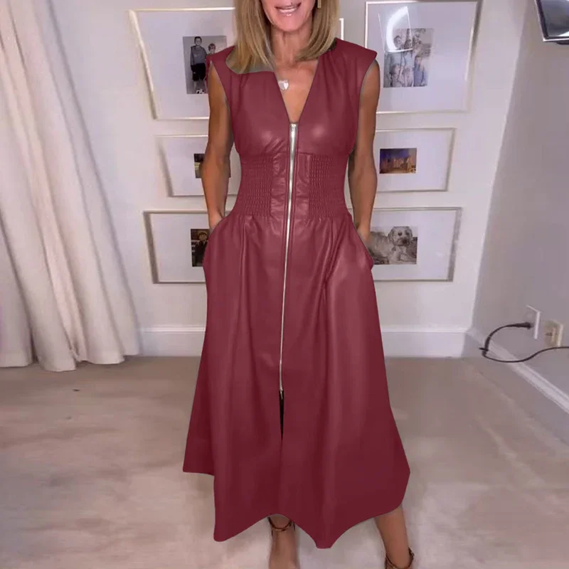Women Zipper PU Leather High Waist Sleeveless Dresses 2025 Vestidos V Neck Solid Color Holiday Dress Women's A-line Maxi Dress