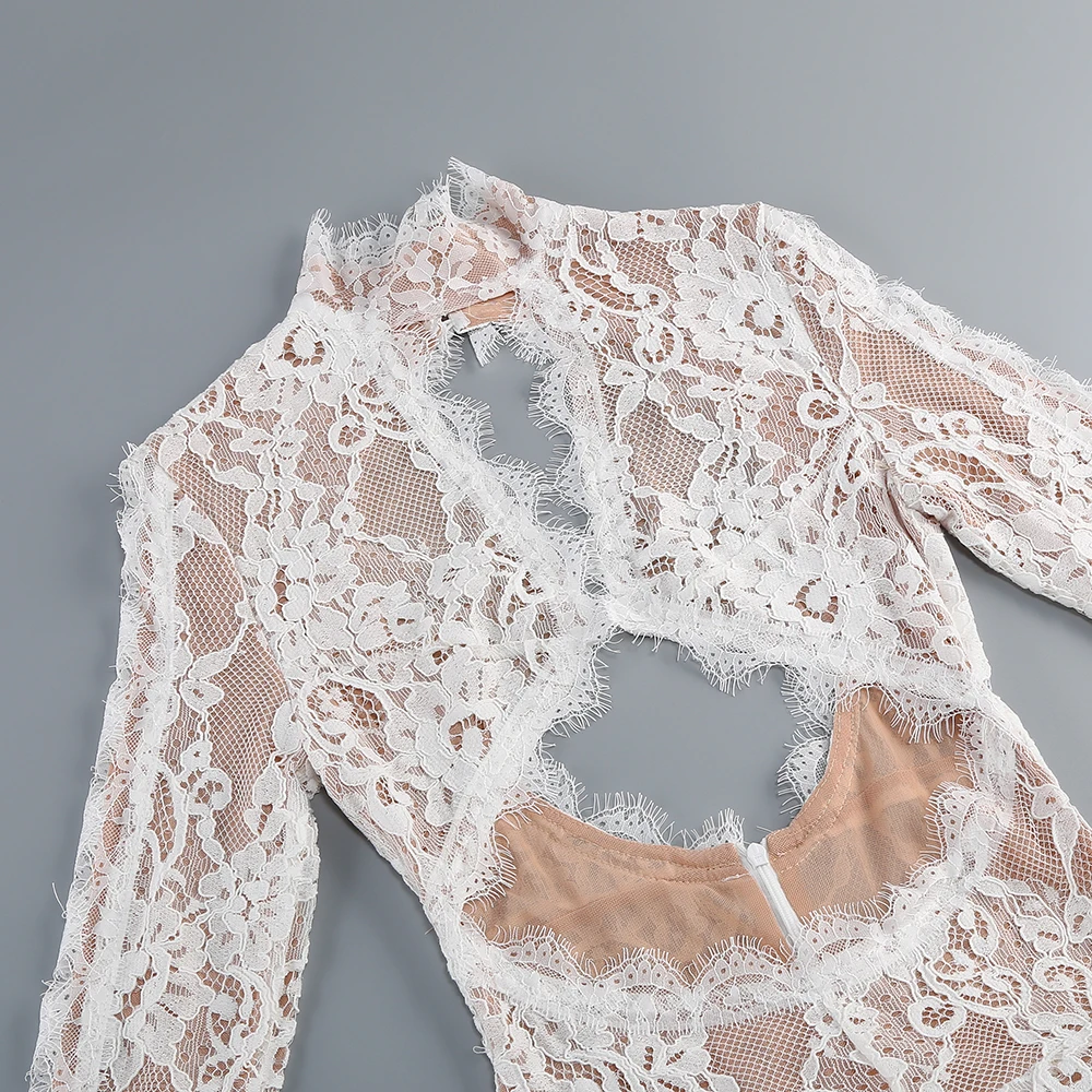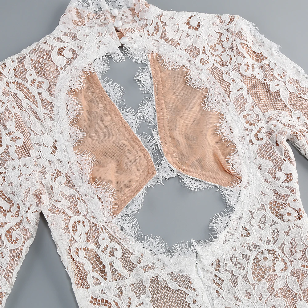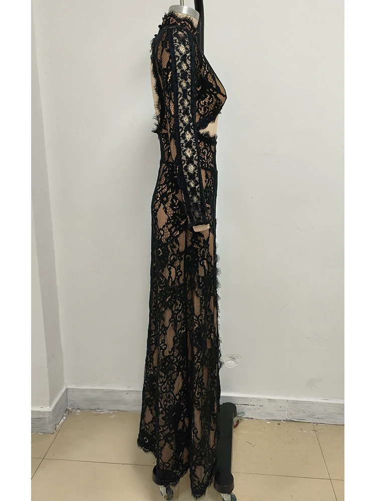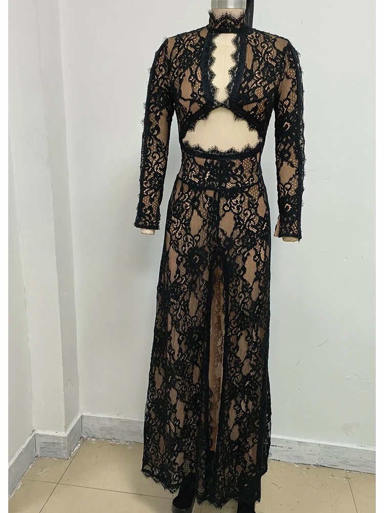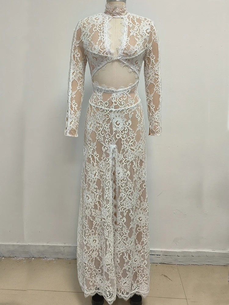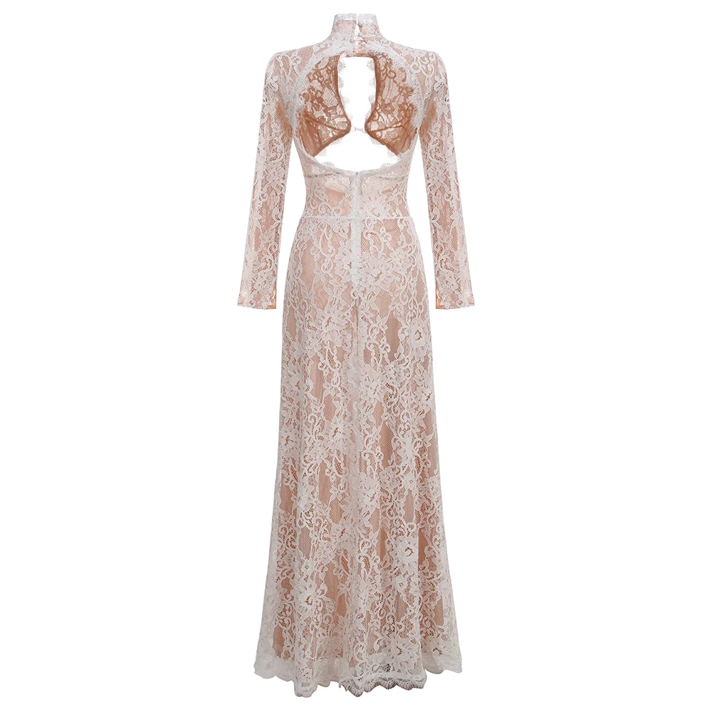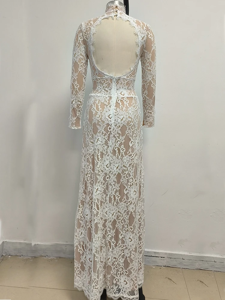 Women's Maxi Lace Cut Out Long Dress Sexy Backless High Split Long-Sleeves Deep V-Neck Celebrity Slim Party Wedding Morning Gown