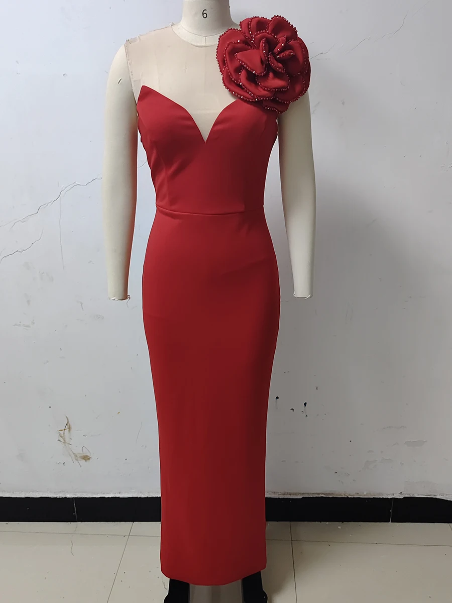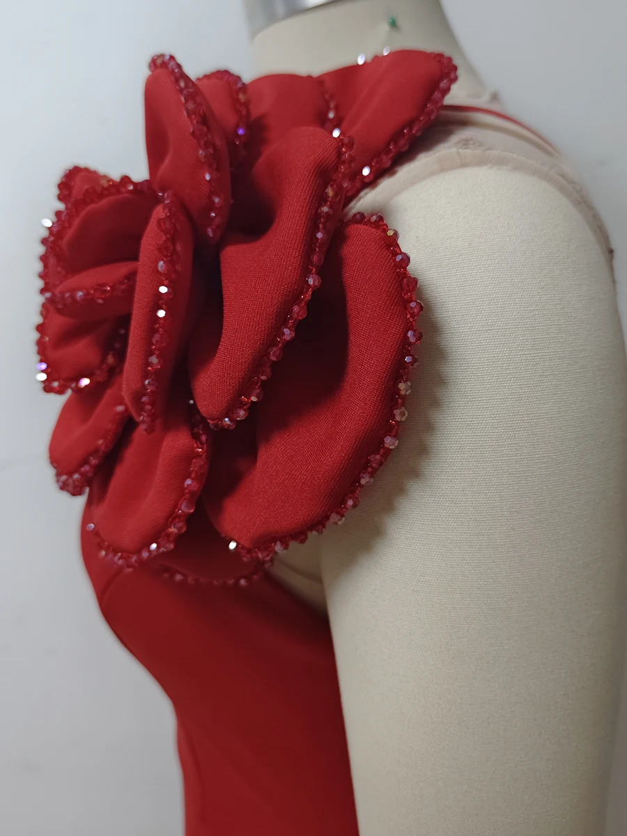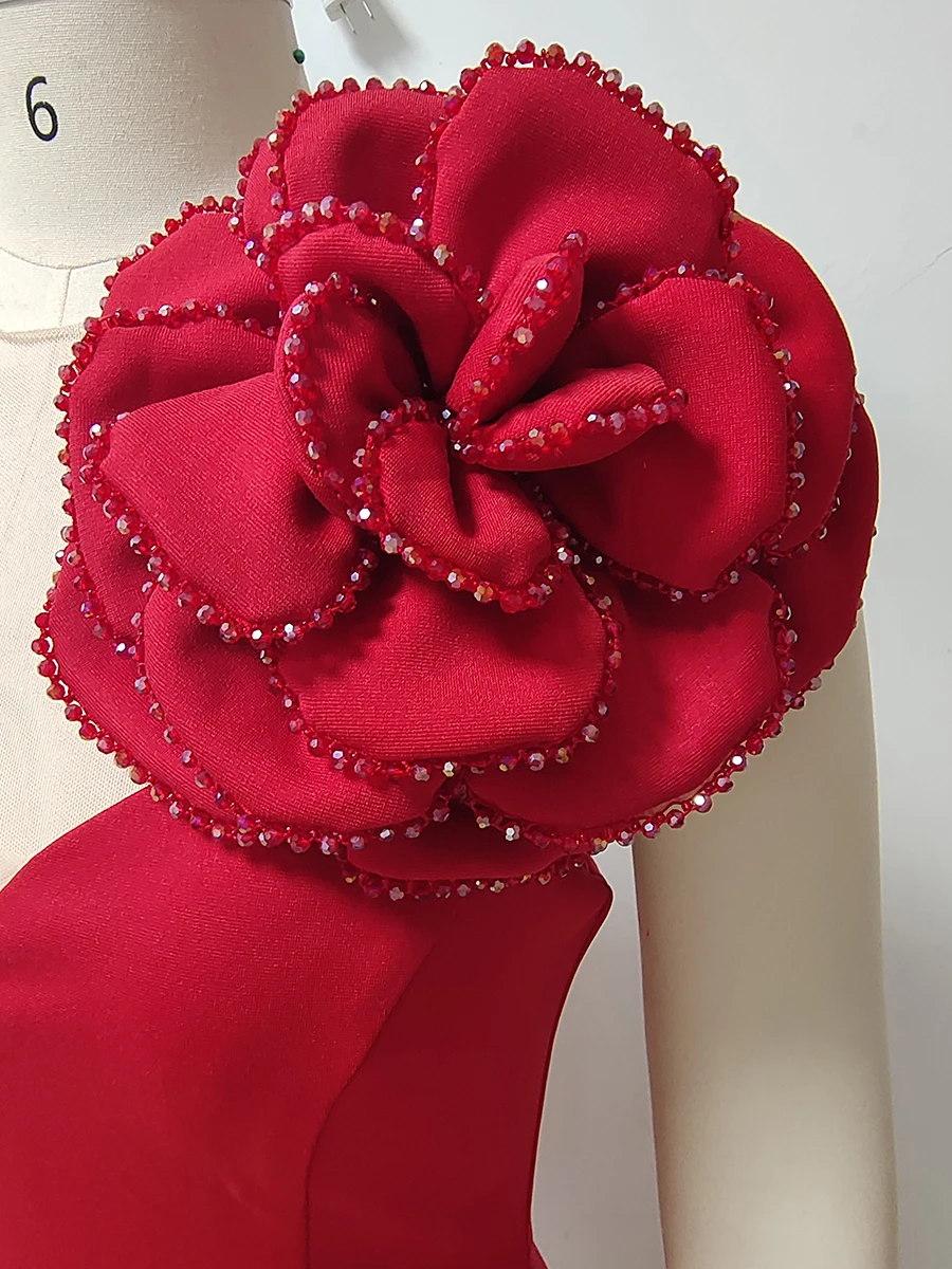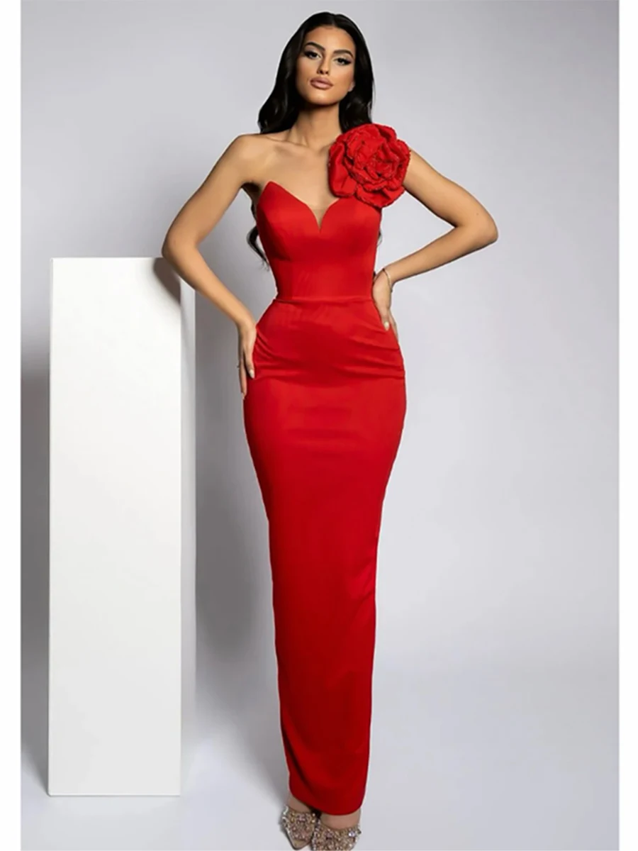 Women's Sexy Glamorous Red One Shoulder Ankle-Length Dress with Large Flower Luxurious Temperament Evening Party Dress
