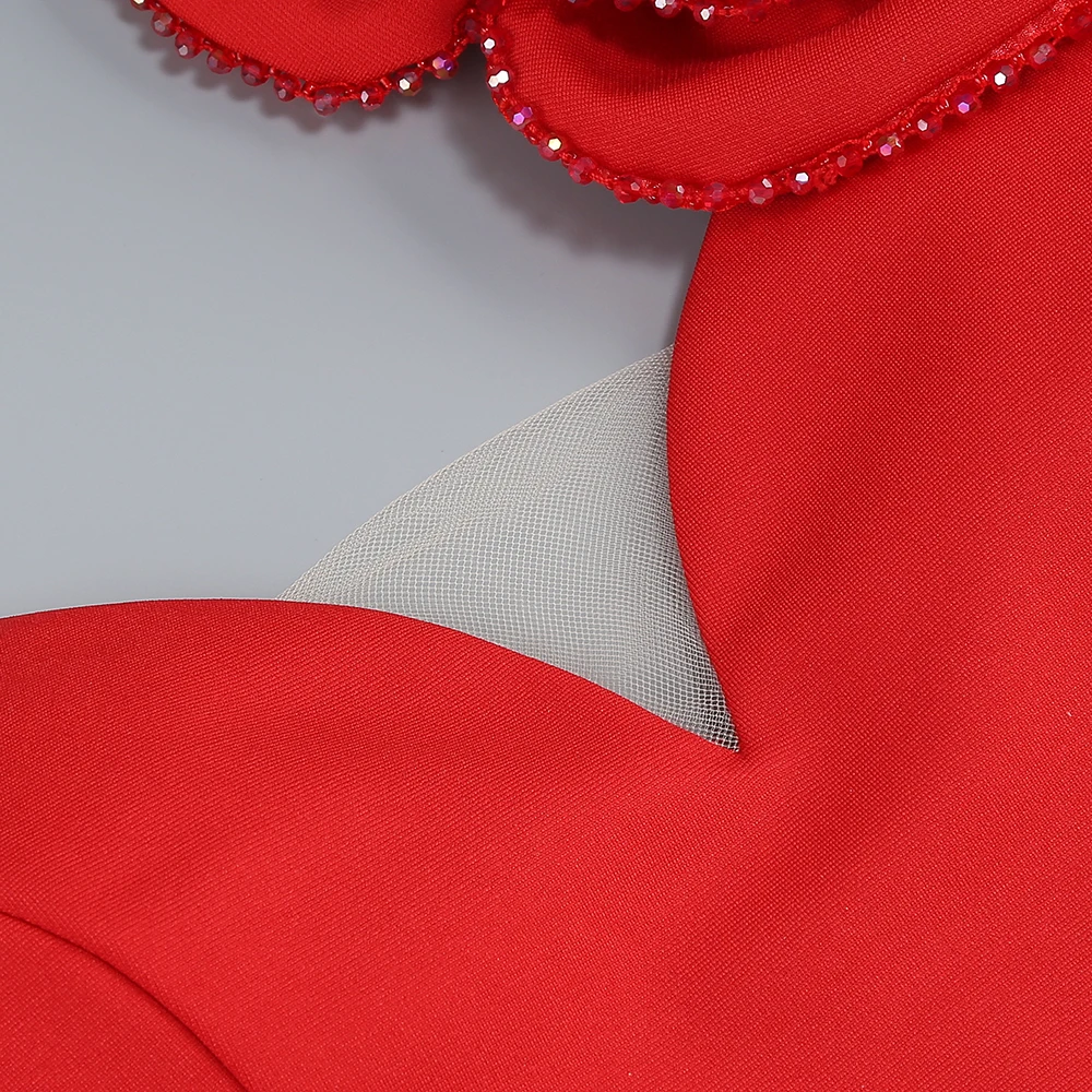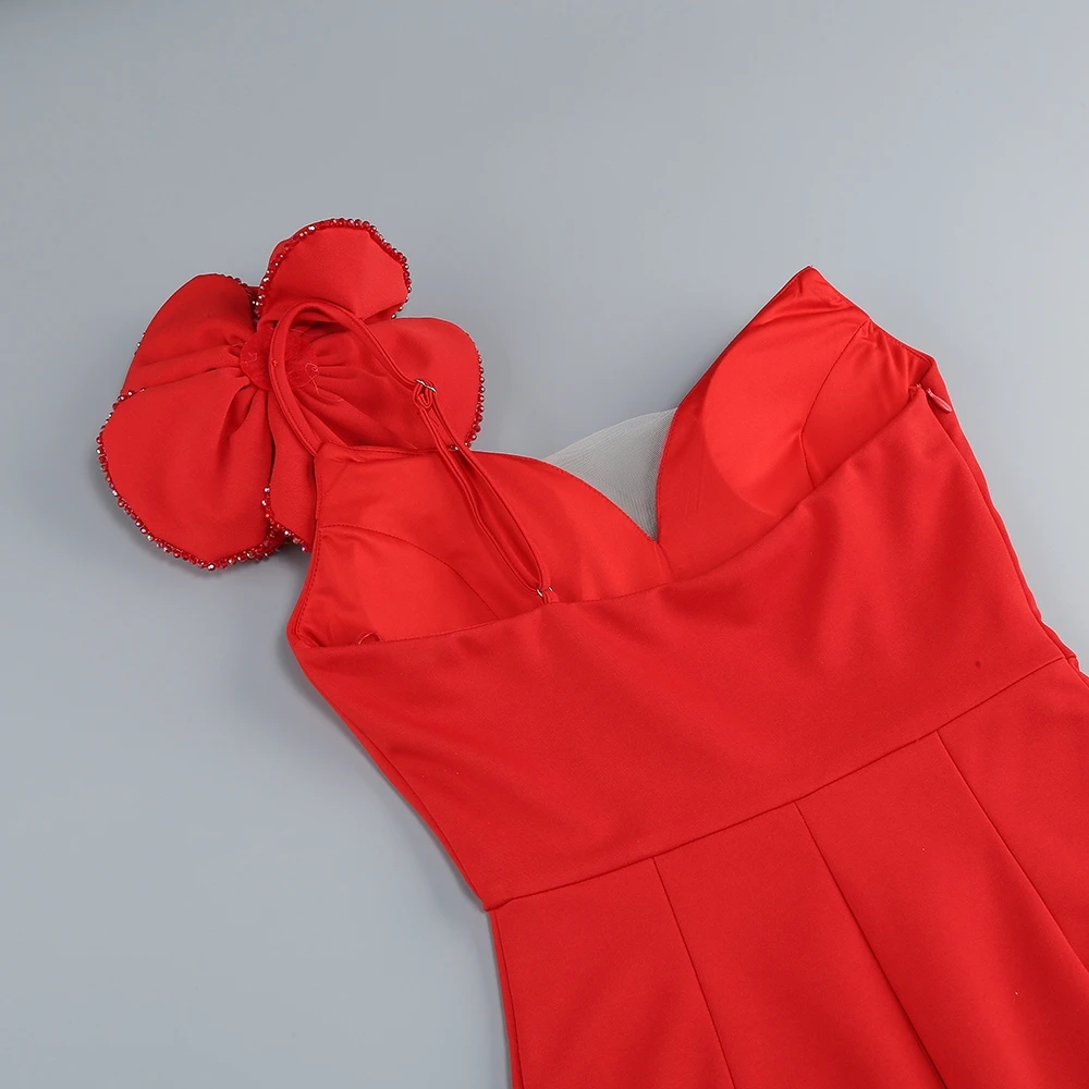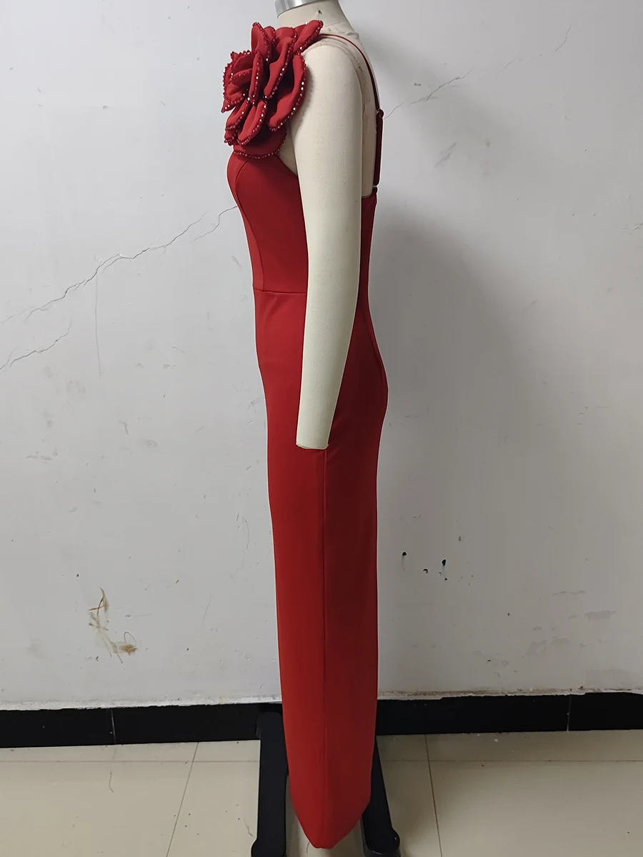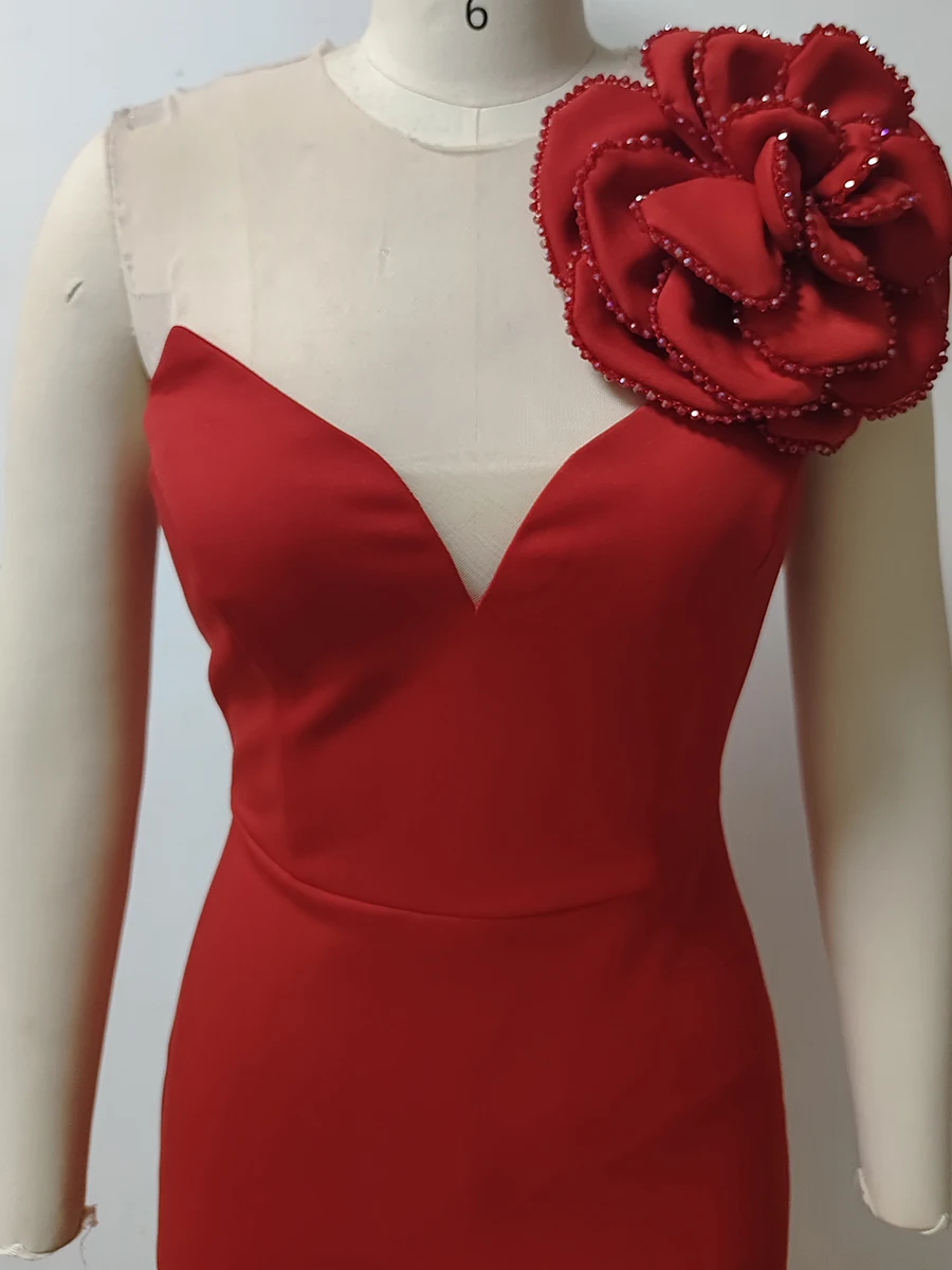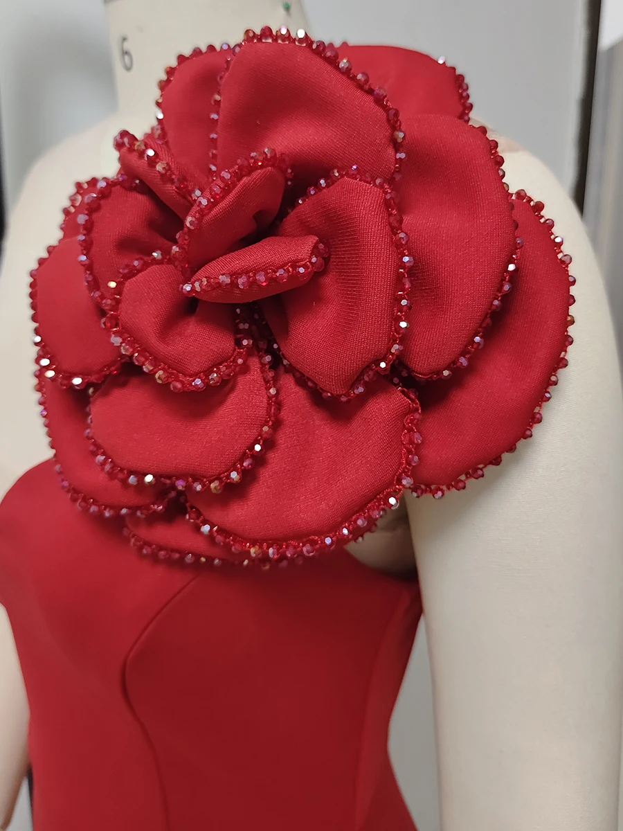 Women's Sexy Glamorous Red One Shoulder Ankle-Length Dress with Large Flower Luxurious Temperament Evening Party Dress