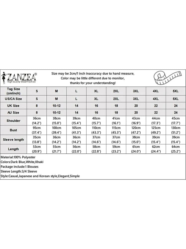 | Item Type:Blouses Material:100% Polyester Colors:Dark Blue,White,Khaki Package include:1 Blouses Cutting:Regular Stretch:Not Stretchable Collar:Round Neck Sleeve Style:Regular Sleeve Length:3/4 Sleeve Features:Slits at cuffs Pattern:Solid Thickness:Standard Style:Casual,Japanese and Korean style,Elegant,Simple Season:Spring,Summer,Autumn Occasion:Daily,Simple,Casual Label: Yes Attention: 1. Due to different computers, there may be subtle color difference between the object and the image. Please don't shoot if you mind. Thank you. 2. There may be manual measurement error of 1-3cm. Please understand the inconvenience. 3. Please refer to the real object. The model pictures are for reference only. 4. Attention!!! Please check the size chart carefully before ordering." |
