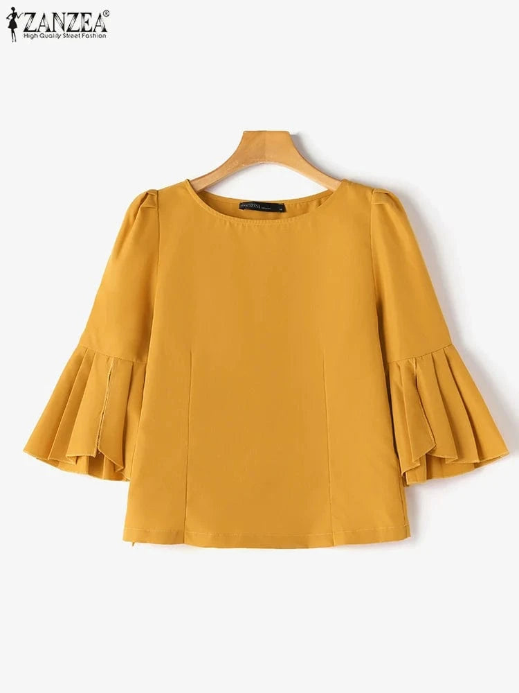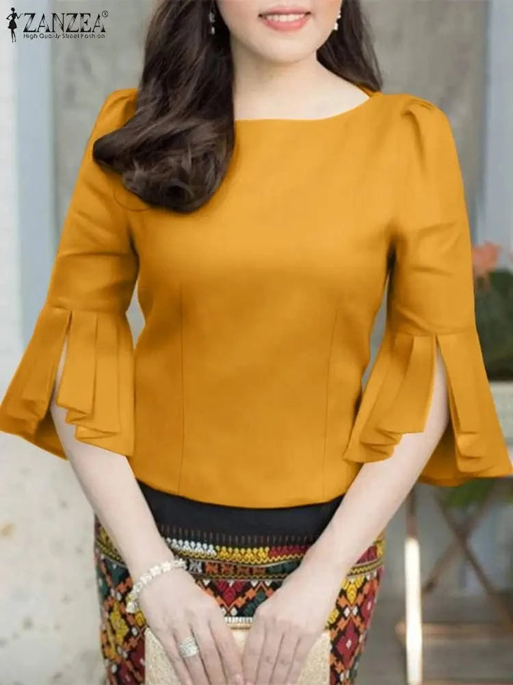 ZANZEA Women Elegant Party Blouse Summer Puff 3/4 Sleeve Tops Shirt 2024 Fashion Solid Boat Neck Tunic Korean Office Lady Blusas
