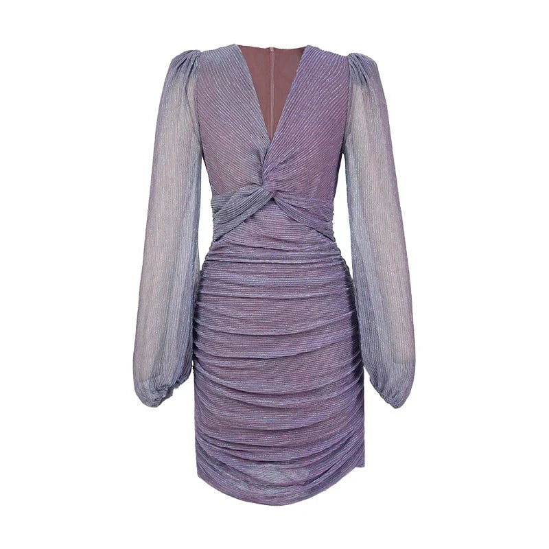 ZYHT 21080 Casual Wear Plus Size Puff Sleeve Ruched Mini Dress Deep V Neck Mesh Shiny Pencil Fold Prom Dress