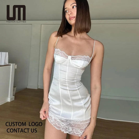 Liu Ming Cadeau de Saint-Valentin 2024 Printemps Femmes Sexy Spaghetti Bretelles Sans Manches Blanc Satin Dentelle Patchwork Mini Robe