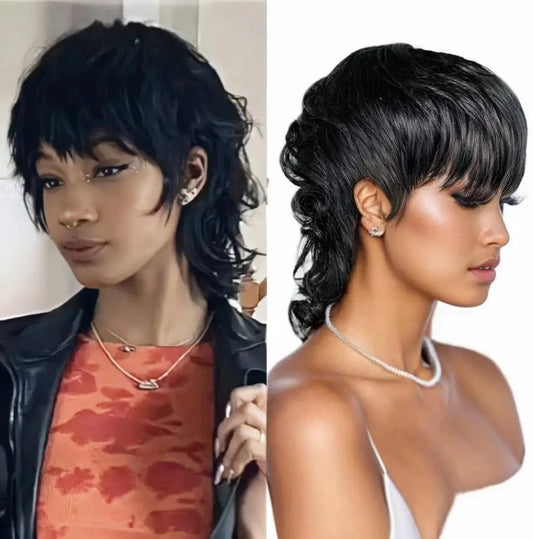 Wear And Go Pixie Cut Wig Short Loose Wave Glueless No Lace Wigs For Women Full Machine Made Wig With Bangs Mullet Style 180% D