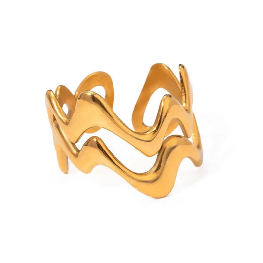 Bague ouverte minimaliste en acier inoxydable plaqué or 18 carats pour femme, double vague, R2579