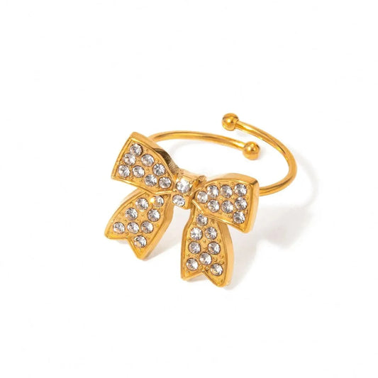 Bague ouverte en acier inoxydable plaqué or 18 carats, avec papillon et fleur, perle de verre blanche collée, R2613