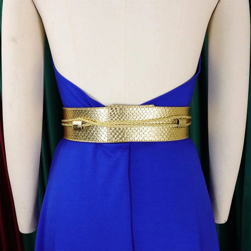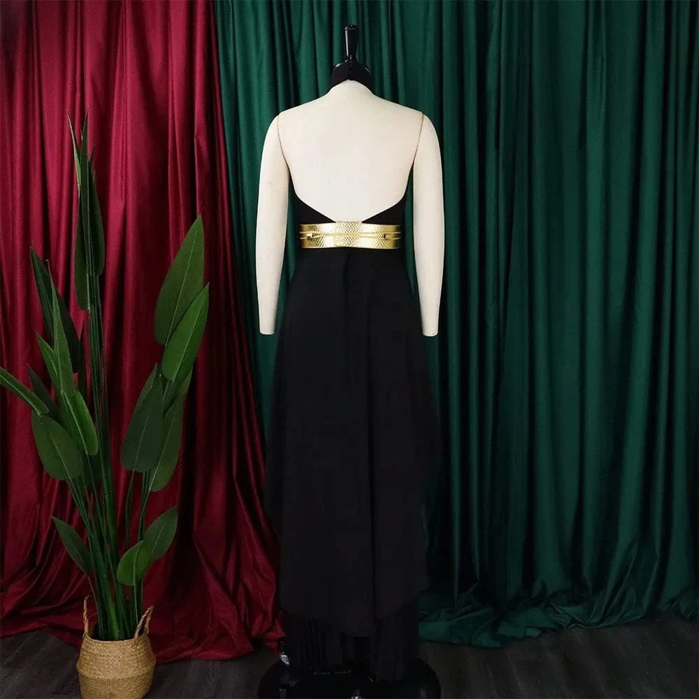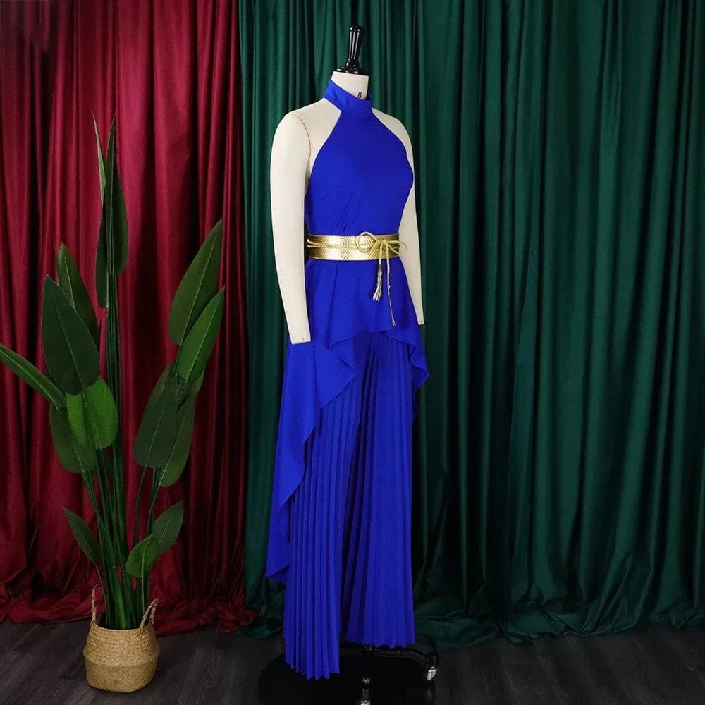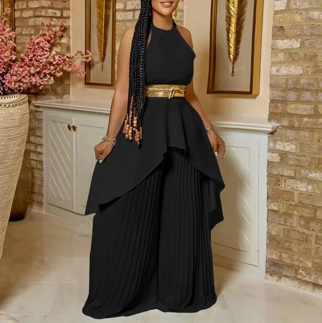2 Pieces Pants Sets Womens Outfits Blouse Extra Long Sleeveless Backless Belt Waisted & Wide Leg Pants Pleated Floor Length Sets