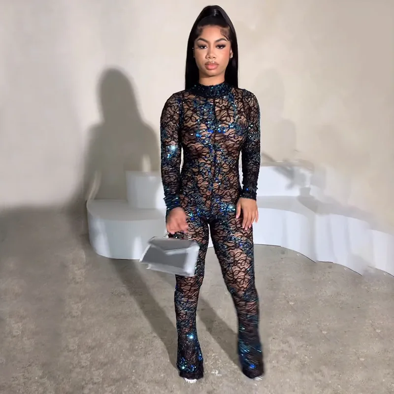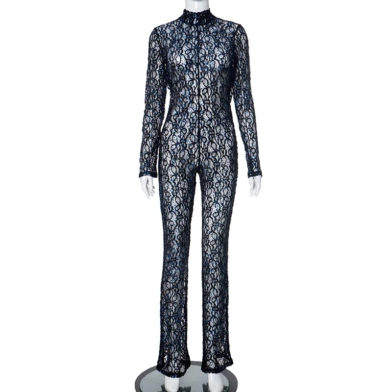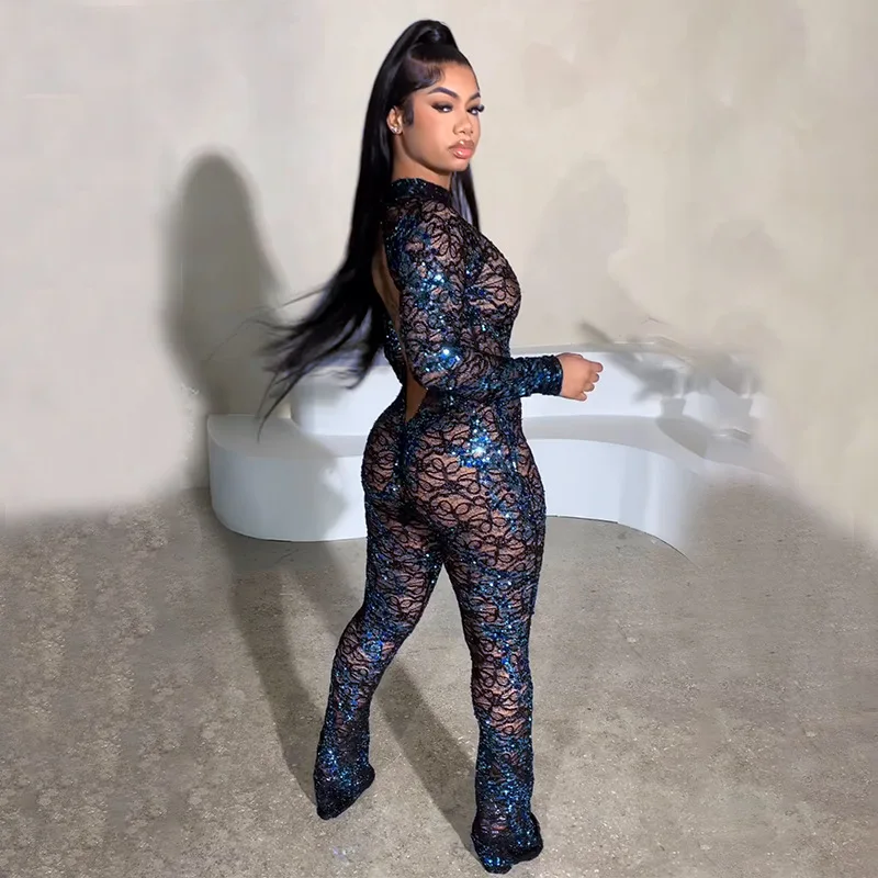 Combinaison dos nu sexy à manches longues pour femmes, combinaison une pièce en dentelle, style patchwork, pour soirée, 2024