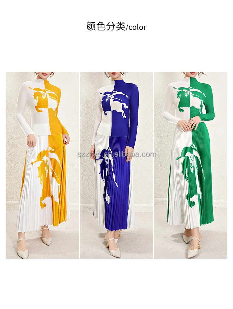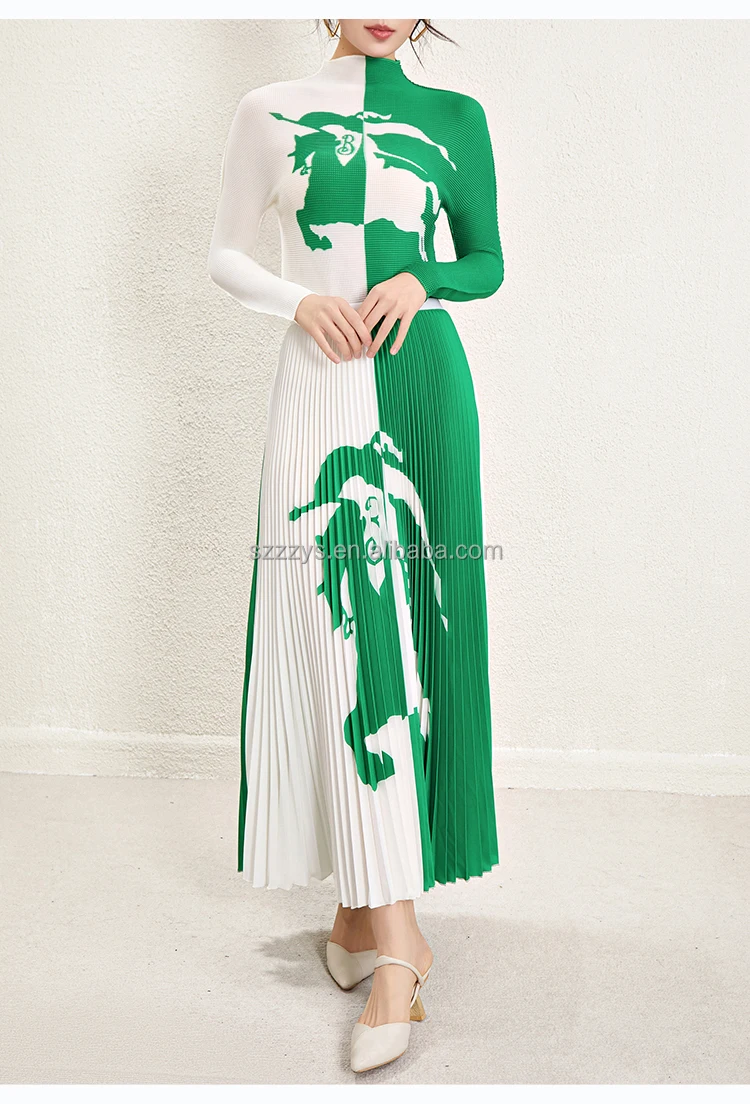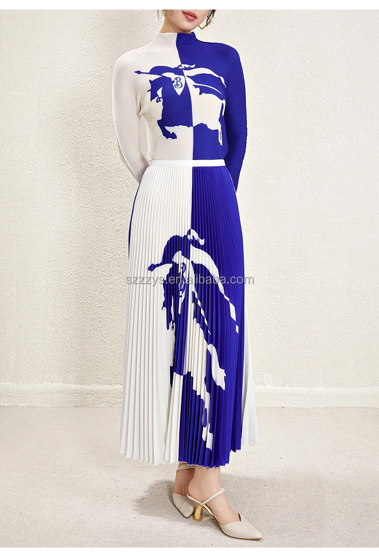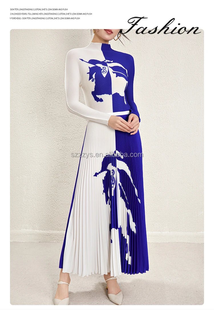 Ensemble de jupe plissée en gros 2024 accepte un haut à manches longues imprimé personnalisé Ensemble de deux pièces de jupe longue plissée imprimée