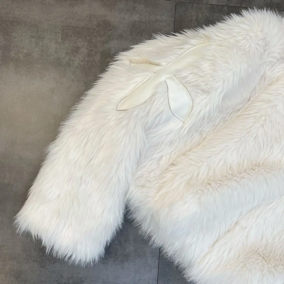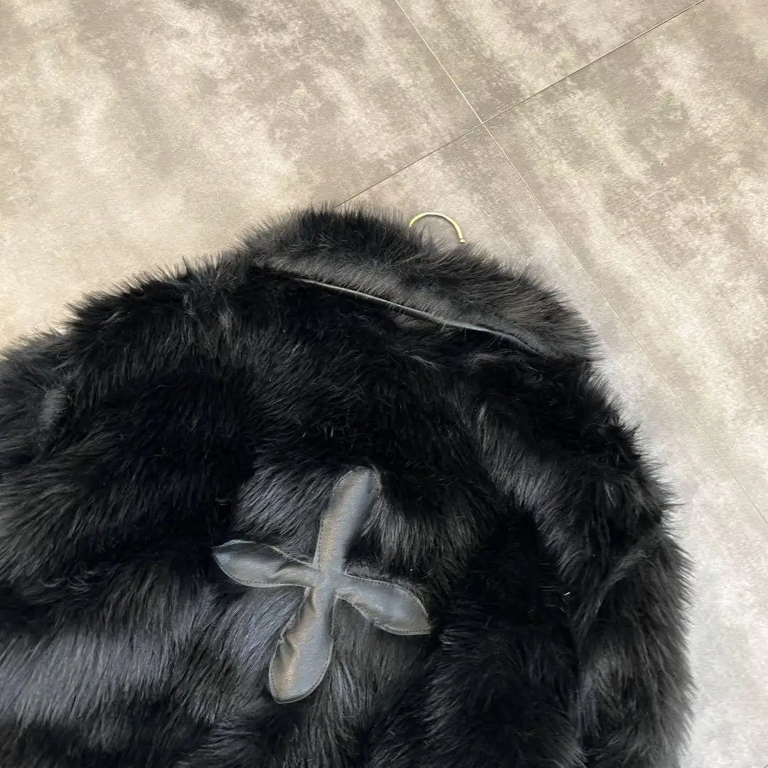 2025 Winter Women Cotton Jacket Lapel Long Sleeve Patch Cross Short Fur Coat Black