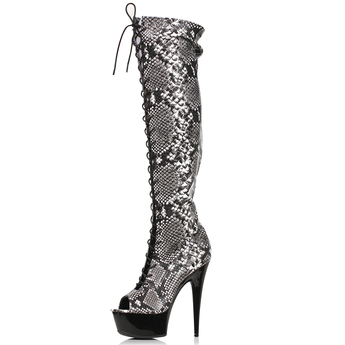 Bottes de danse exotiques à talons fins, imprimé serpent, style gothique, à lacets, au-dessus du genou, bout ouvert, 15 cm, pour femmes, strip-teaseuses, pole dance, gladiateur
