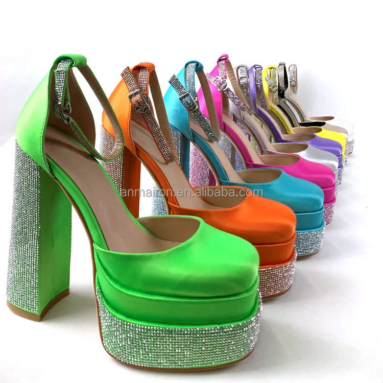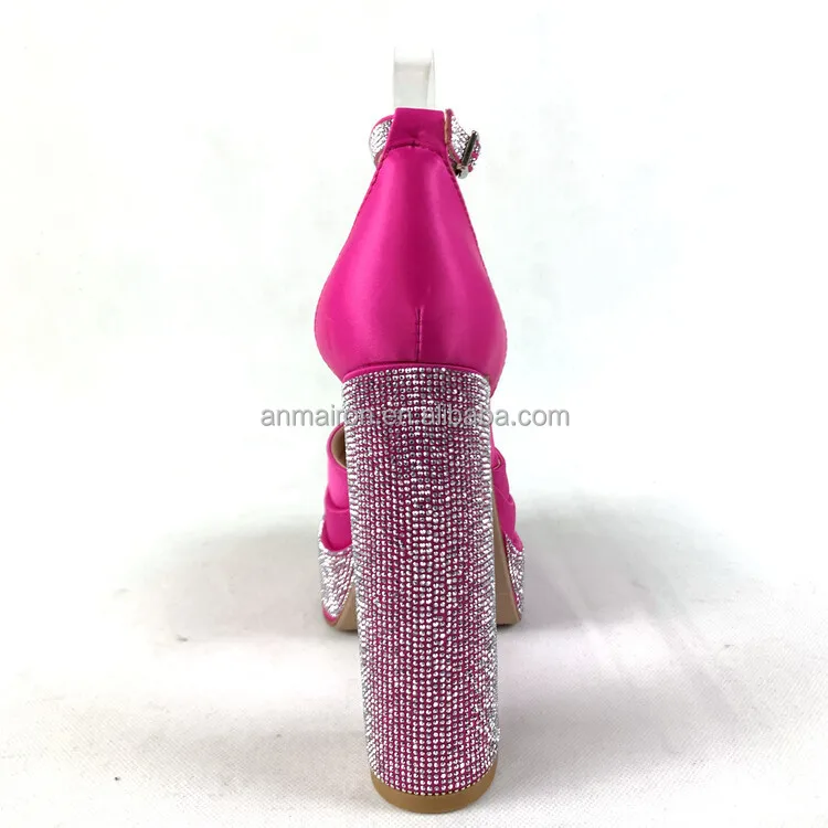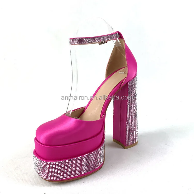 ANMAIRON Vente chaude Chaussures habillées Chengdu Haute Qualité Rose Vif Satin Bout Carré Plateforme Chaussures Luxe Strass Plateforme Pompes