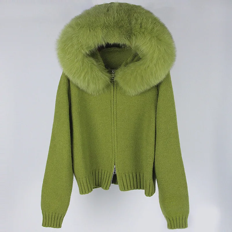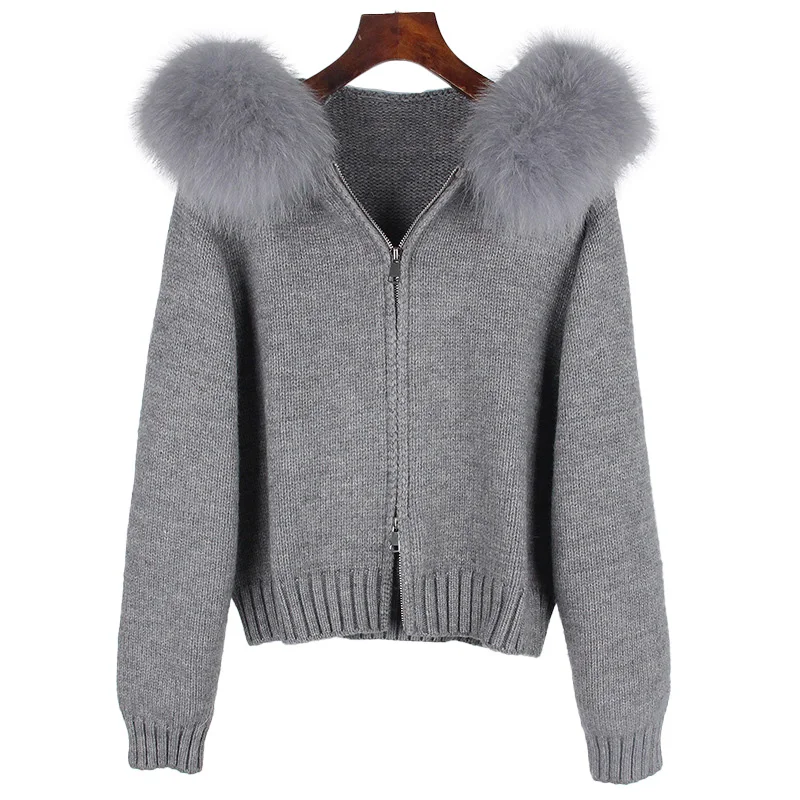 Pull en fourrure à manches longues pour femme, couleur unie, automne-hiver, cardigan tricoté avec capuche en fourrure de renard