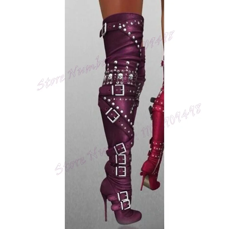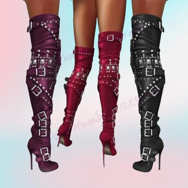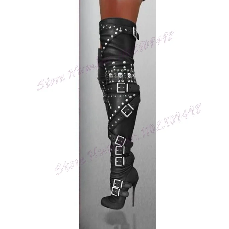 Black Strappy Buckle Decor Boots Rivet Over The Knee Pointed Toe Shoes for Women Thin High Heels Shoes 2025 Zapatos Para Mujere