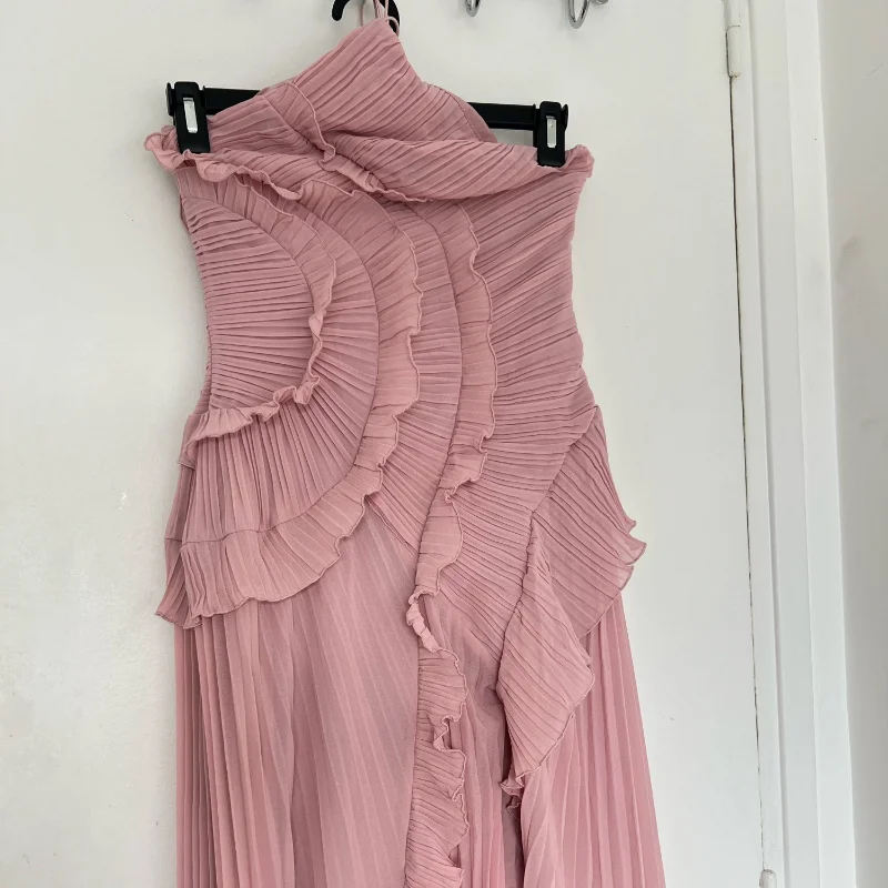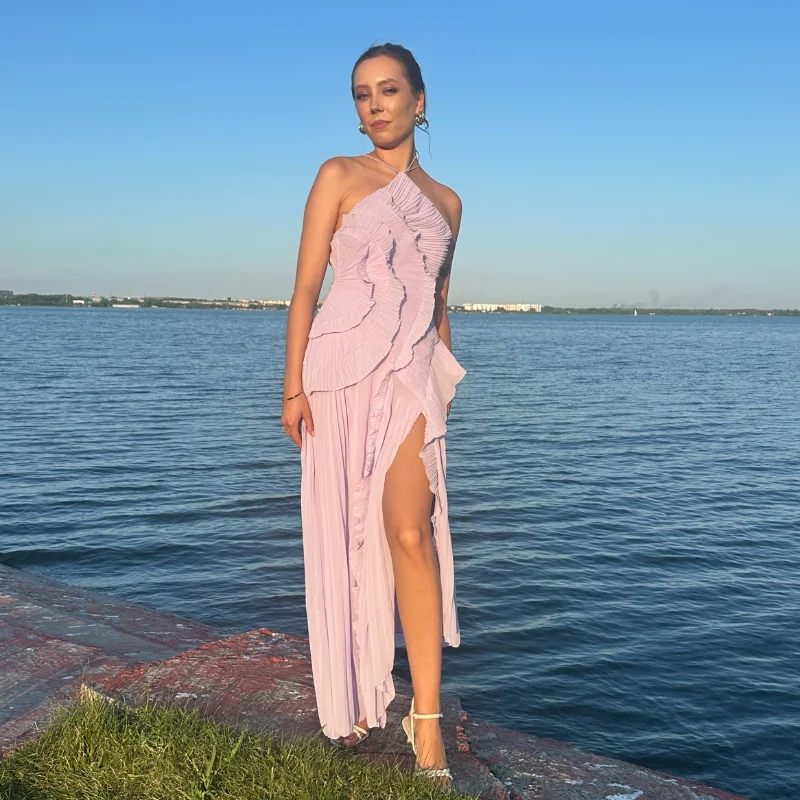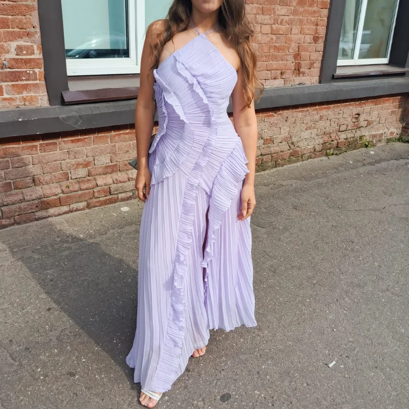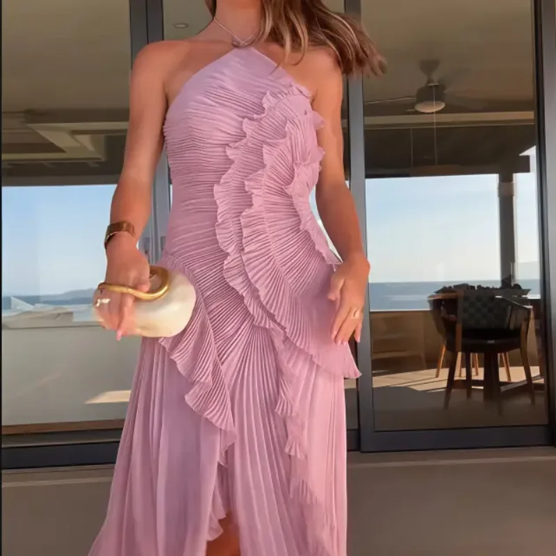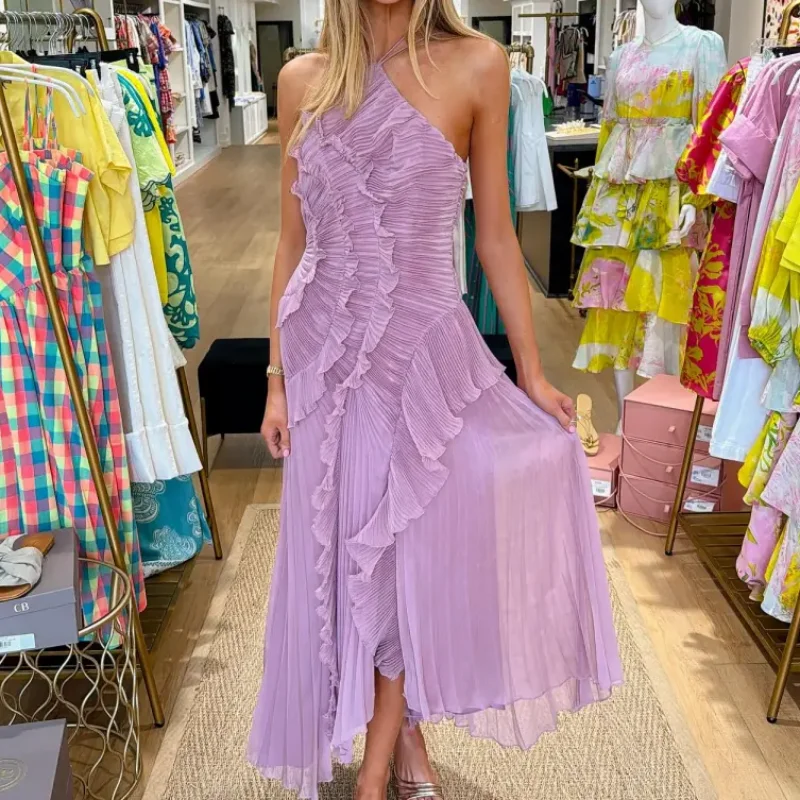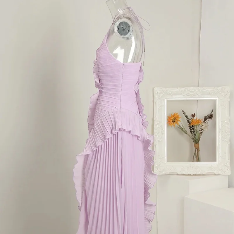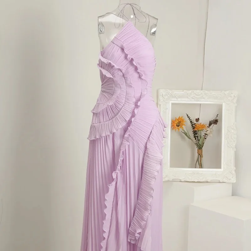 Chic Pleated Halter Neck Long Vacation Dress High Quality Purple Strapless Lotus Edge Maxi Dress 2025 New Lady Vacation Gown