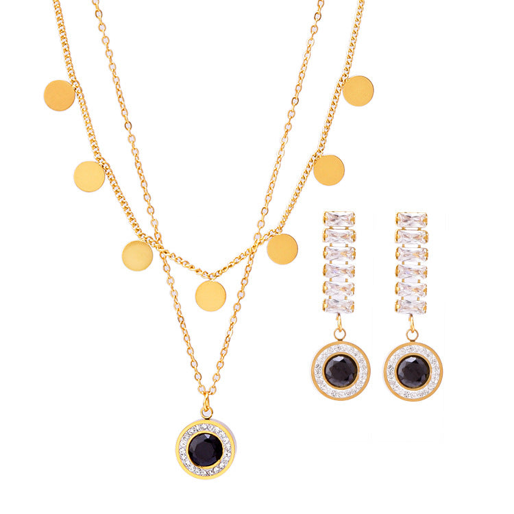 | Nom du produit | Ensemble de bijoux élégants en acier inoxydable pour femmes, pendentif disque en zircon noir, double chaîne, boucles d'oreilles et pompons à paillettes |
