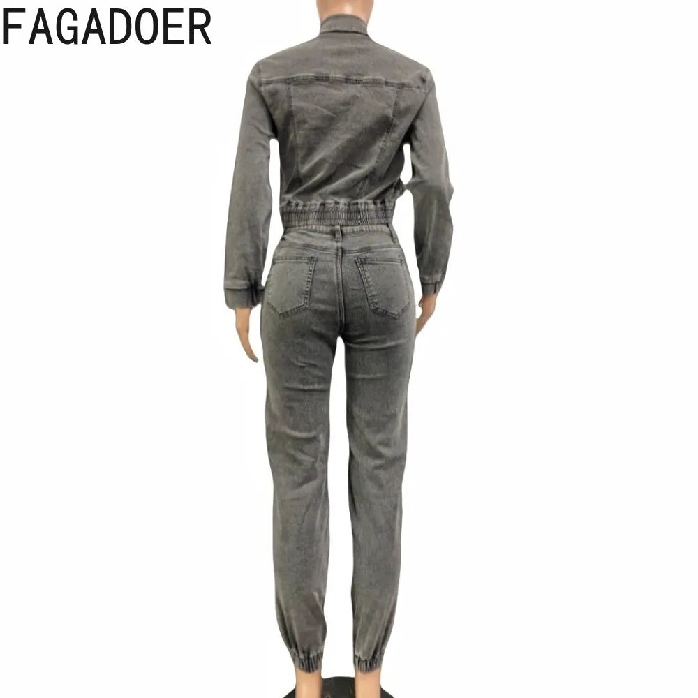 FAGADOER Fashion Denim Two Piece Set for Women Y2k Streetwear Lapel Zip Crop Jacket And Cargo Pockets Stretchy Jeans Outfits