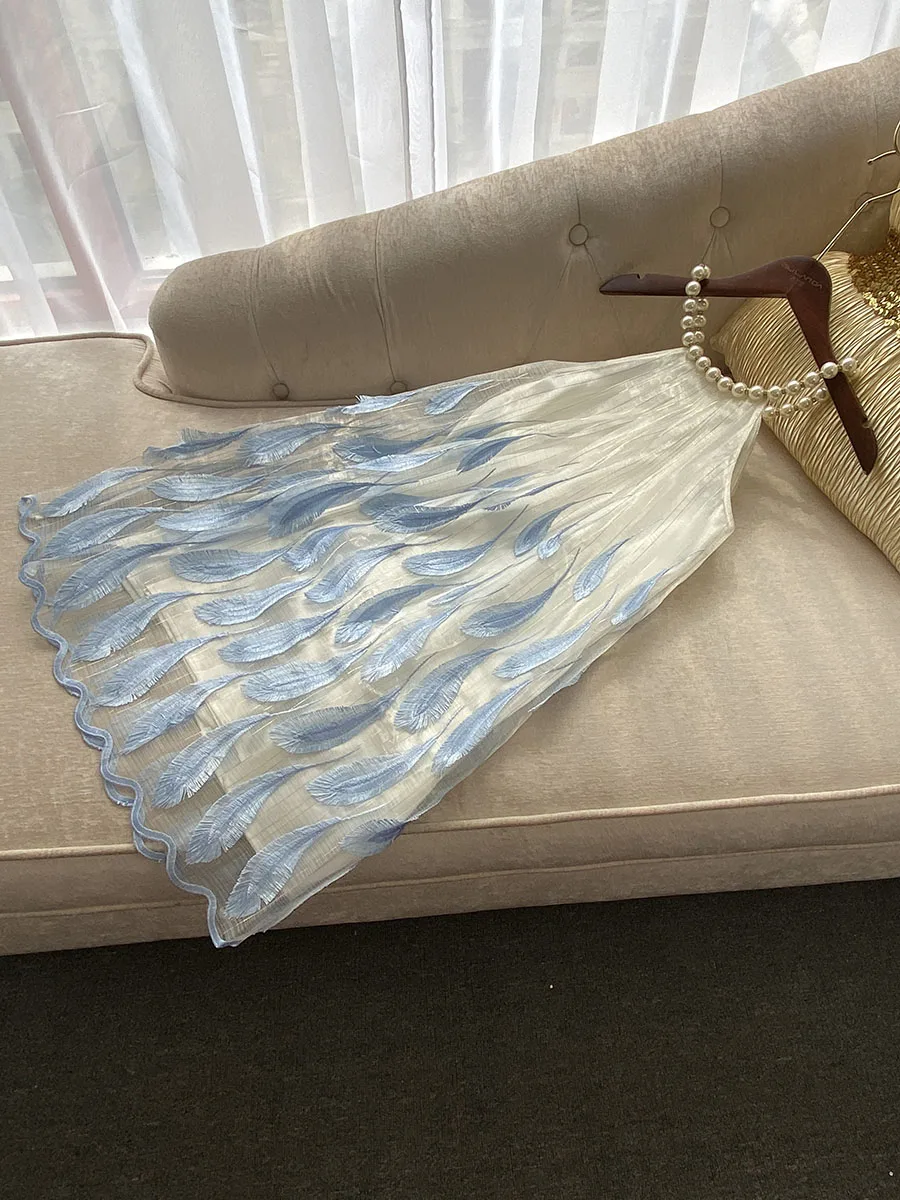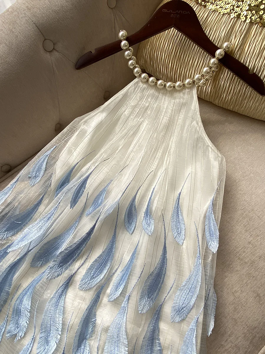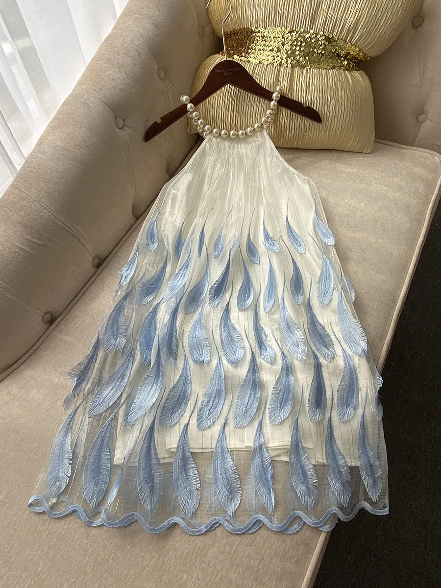 Fashion Sweet Short Elegant Dress 2024 Summer New Heavy Pearl Halter Blue Feather Embroidered Gold Thread Sleeveless Sling Dress