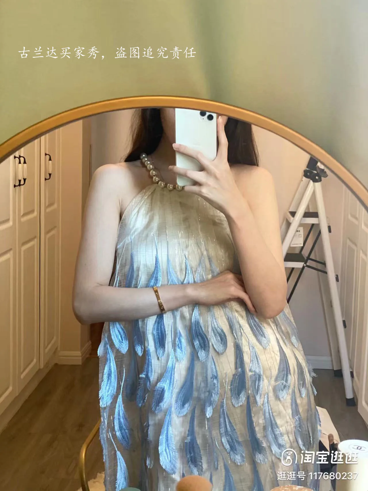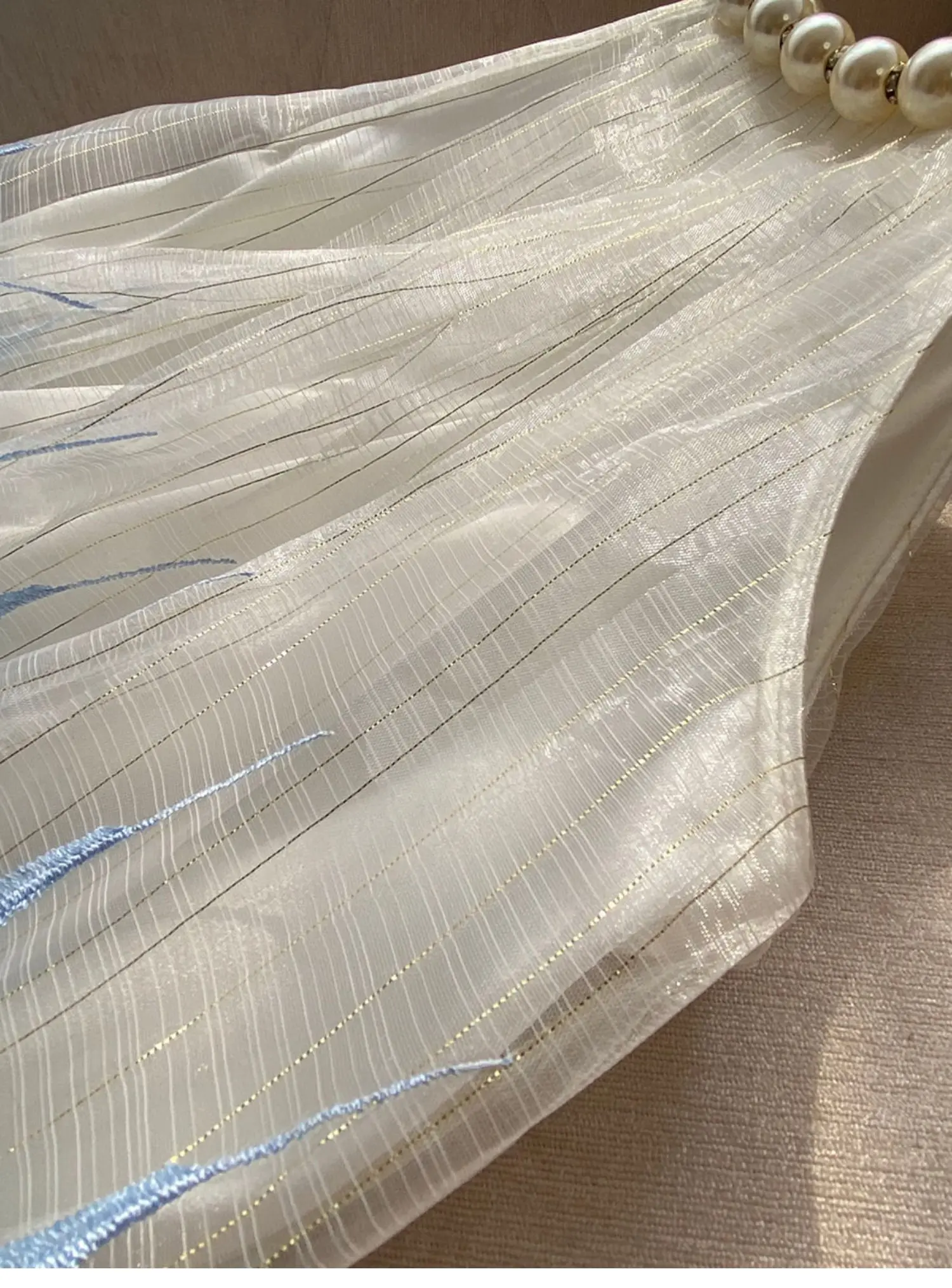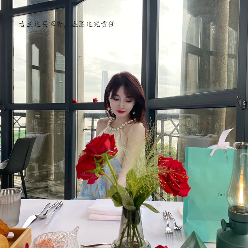 Fashion Sweet Short Elegant Dress 2024 Summer New Heavy Pearl Halter Blue Feather Embroidered Gold Thread Sleeveless Sling Dress