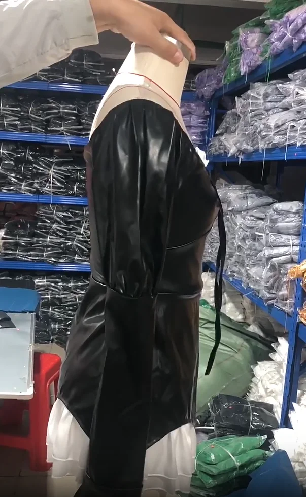 Fengway 2024 Robe ajustée en cuir synthétique pour femme, manches longues, col carré, patchwork, volants, plissée