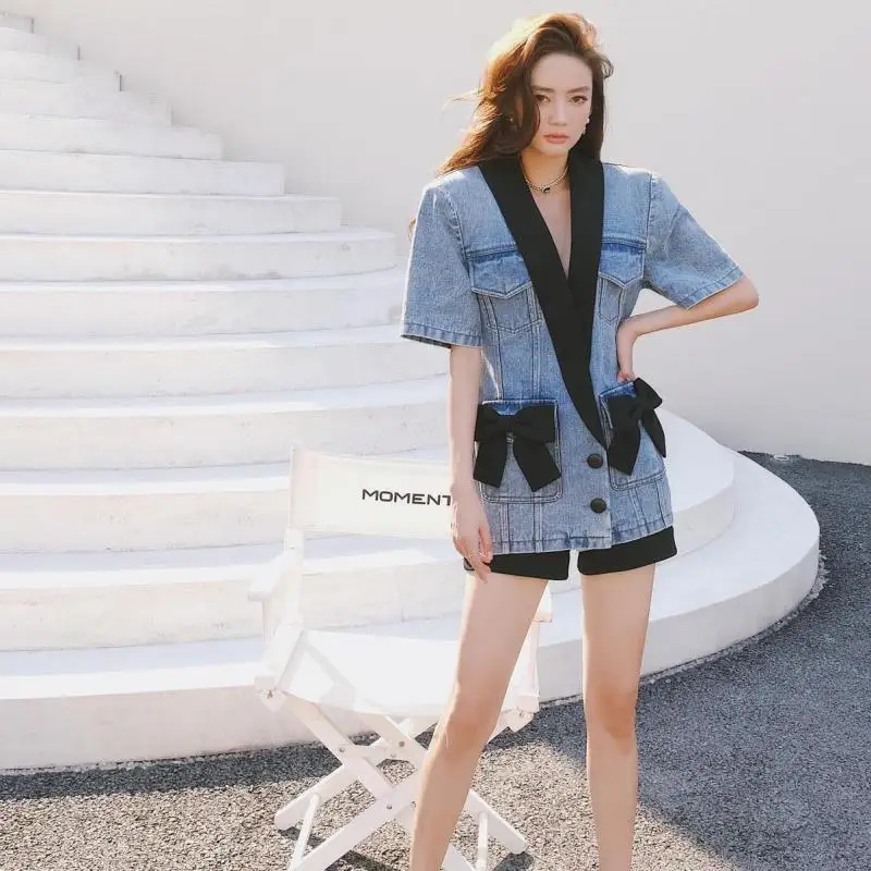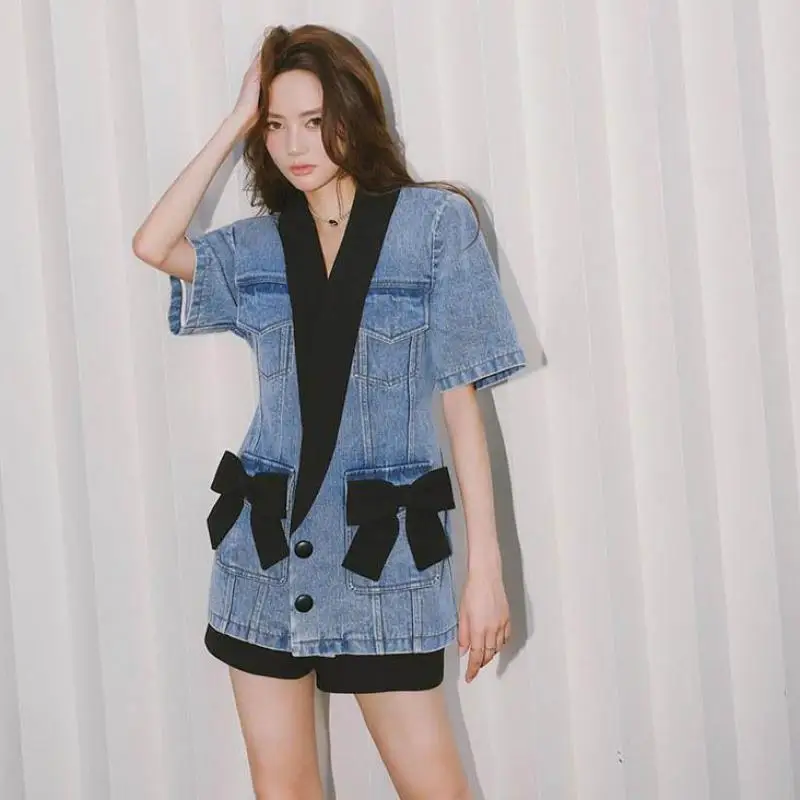 Robe en jean à col en V et nœud assorti, style rétro et sexy, courte, pour filles, vêtements d'été 2021