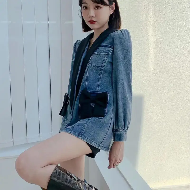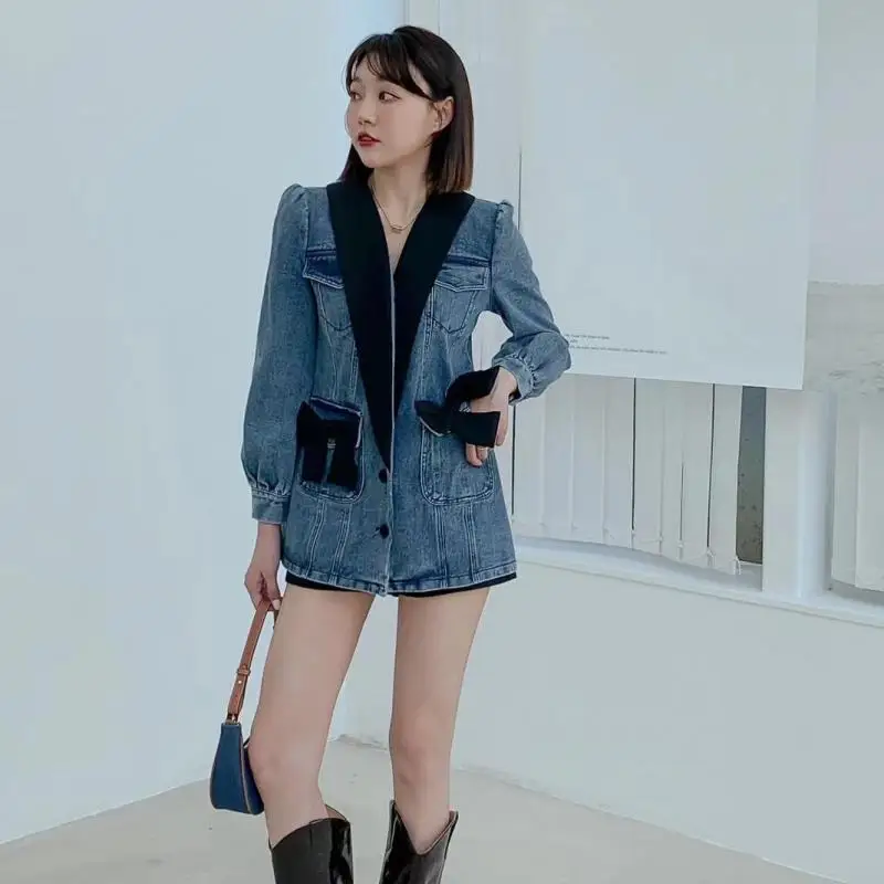 Veste en jean avec fourrure pour femme, robe en denim, col en V, couleur assortie, nœud, robes en denim, rétro, sexy, courtes, pour filles