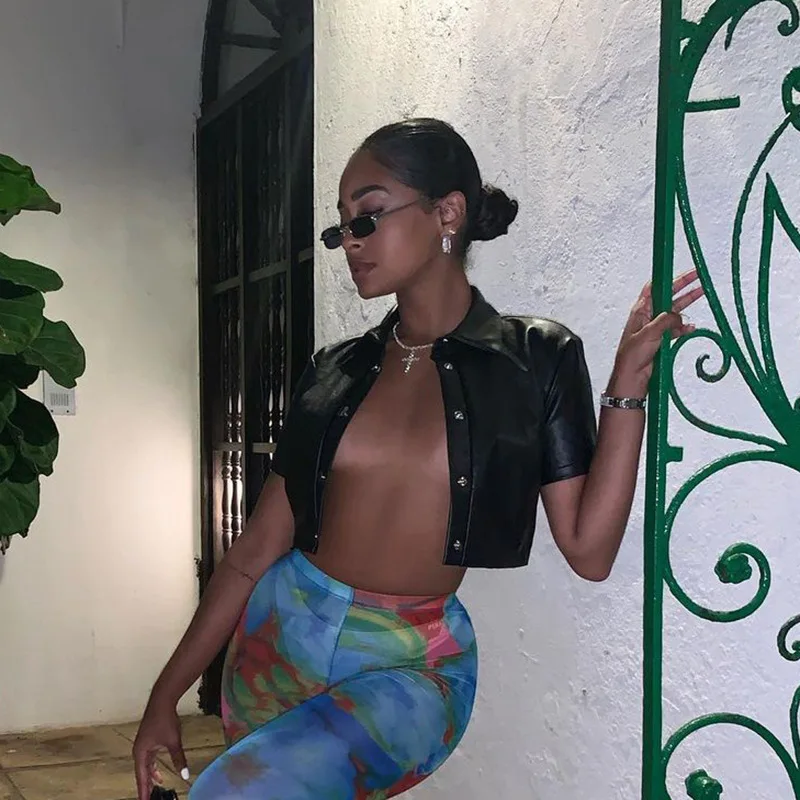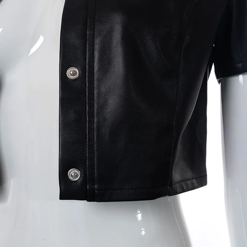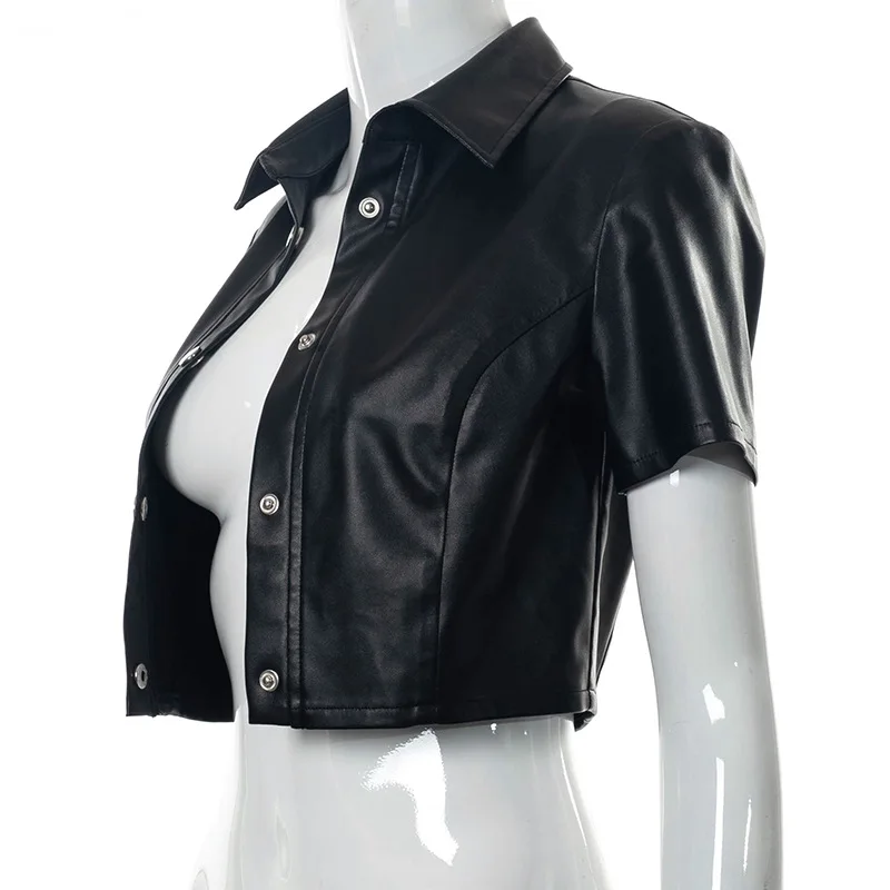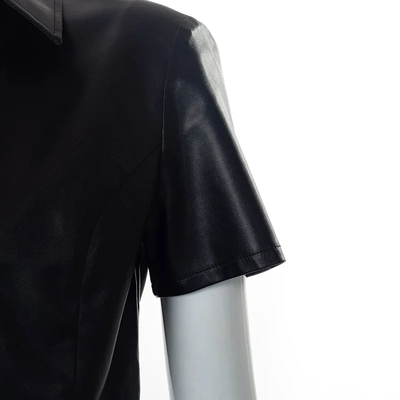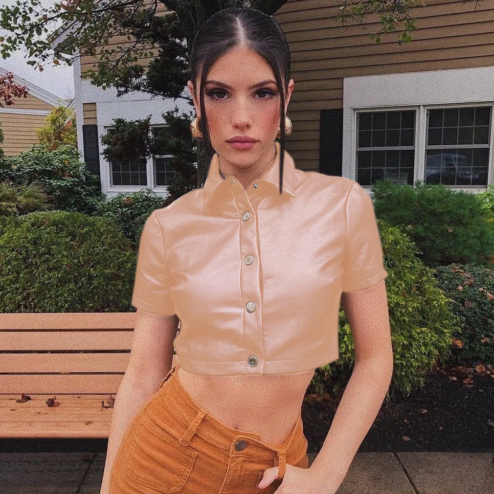 Chemise sexy à manches courtes en cuir PU uni pour femme, offre spéciale, 2023