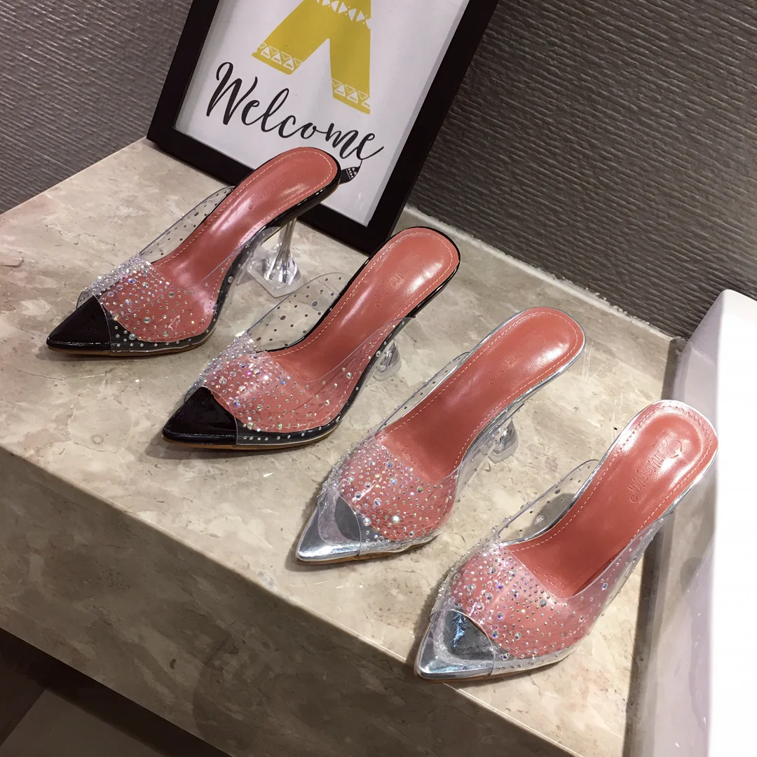Vente chaude sexy femmes clair PVC peep toe strass stiletto pantoufles bout pointu sexy dames chaussures sandales à talons hauts