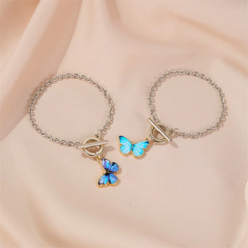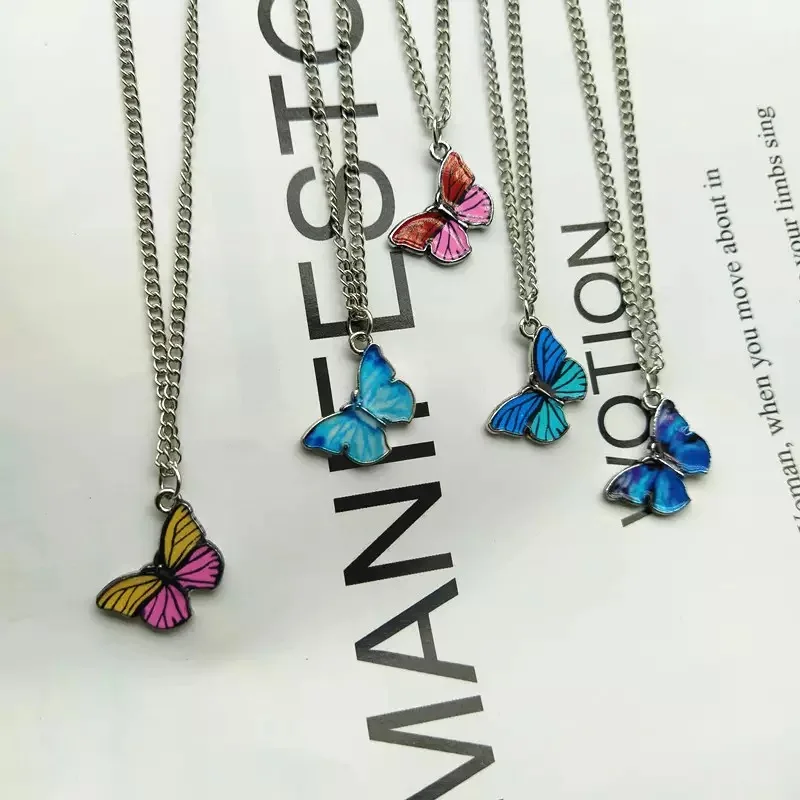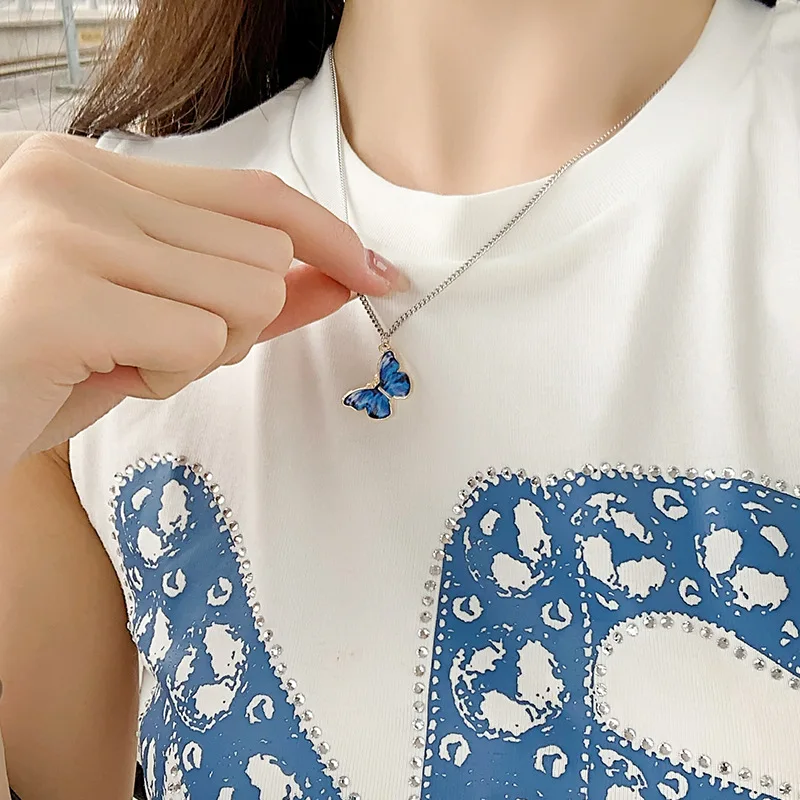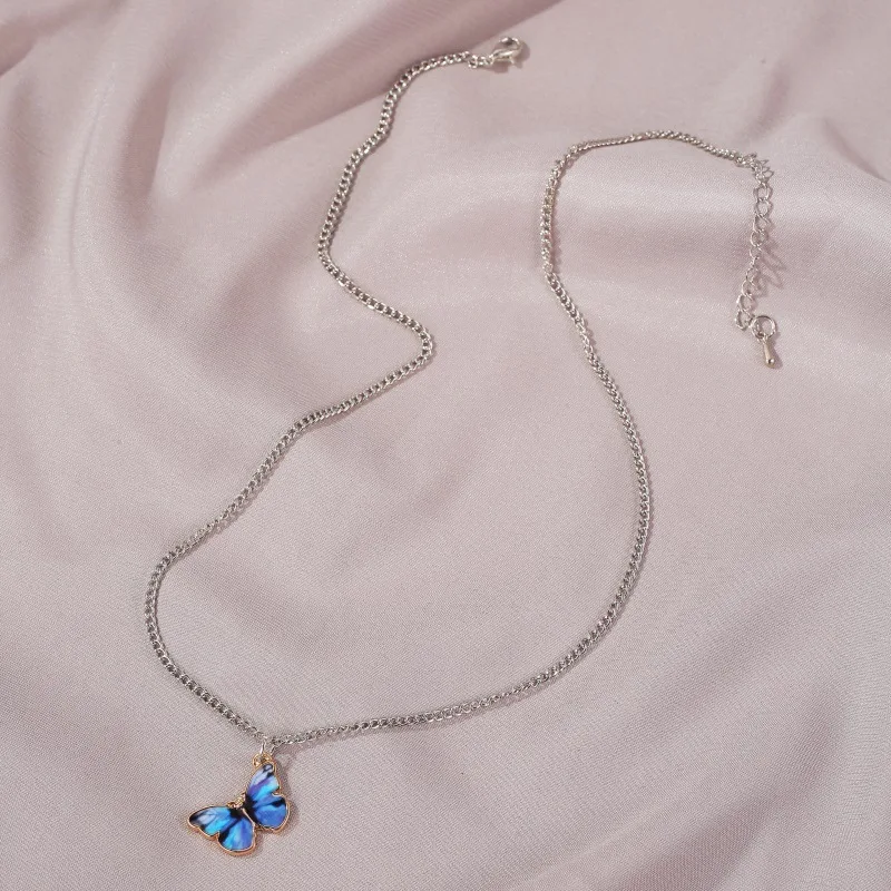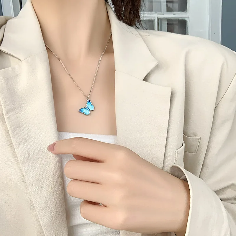 Collier ras du cou avec pendentif papillon dégradé bleu coréen pour femmes et filles, couleur argent, bijoux cadeau, vente en gros