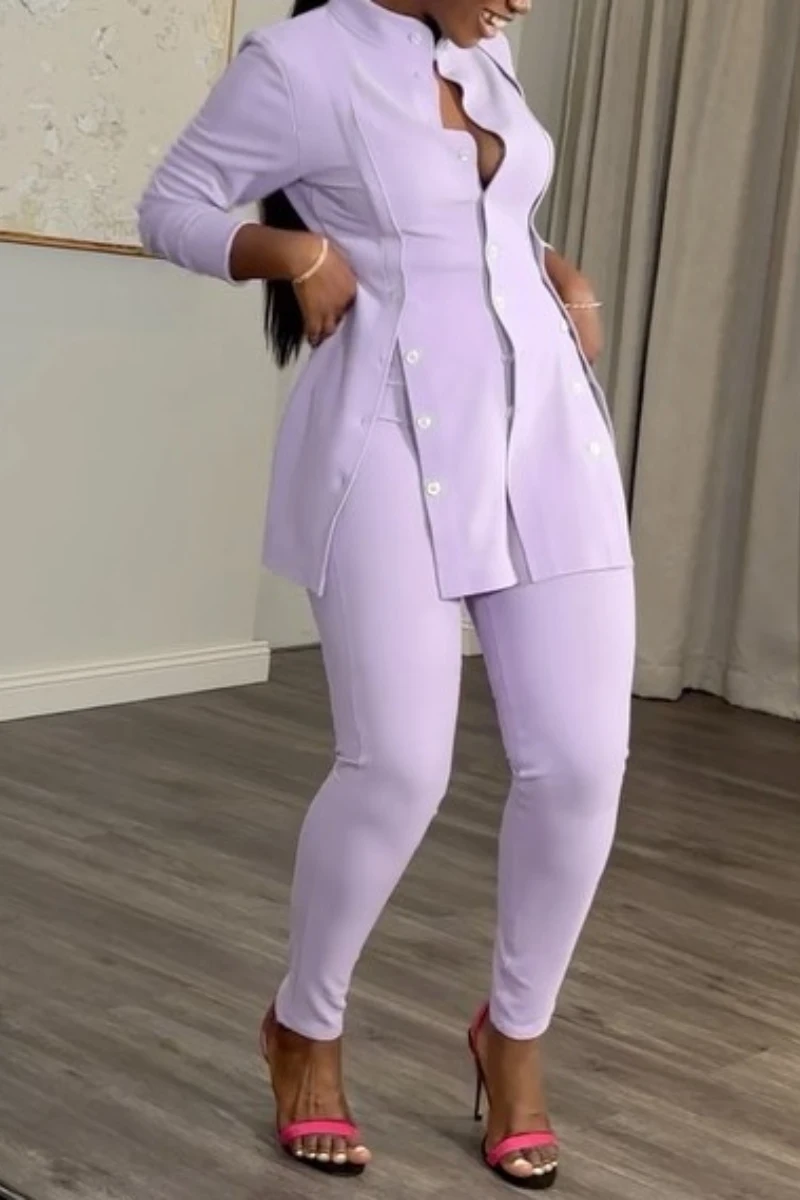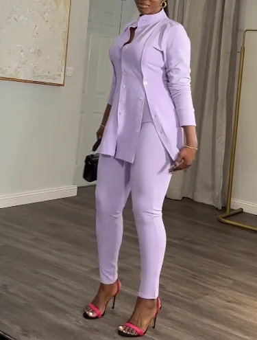 L28530 Chemise décontractée à boutons et fentes, couleur unie, col et manches longues, deux pièces