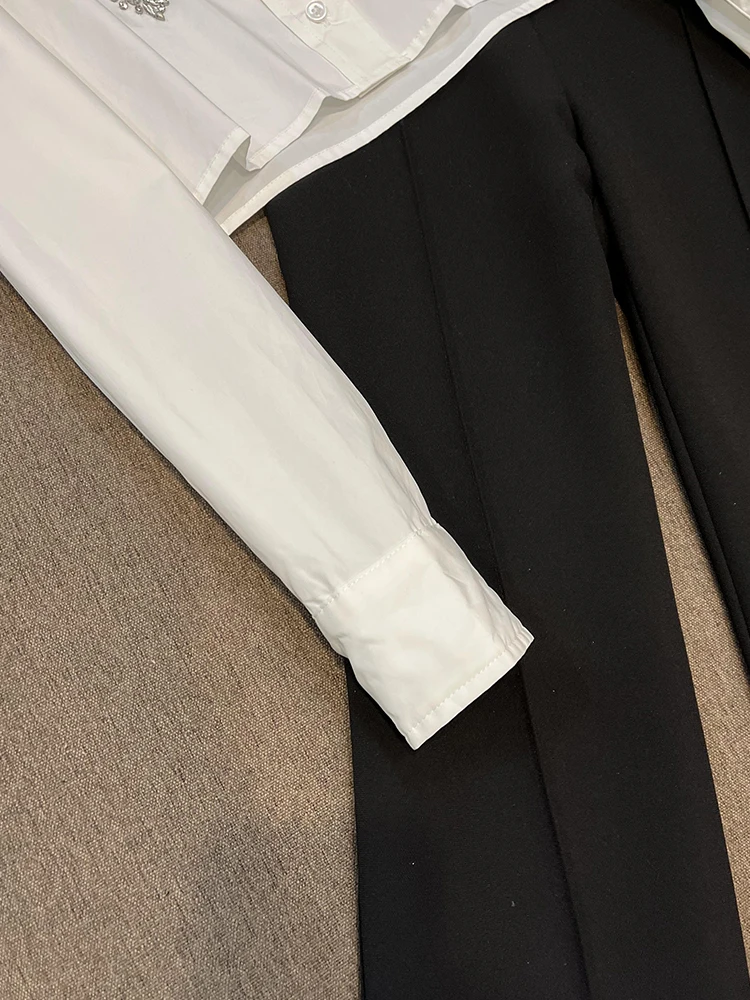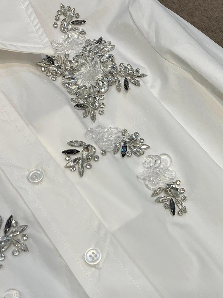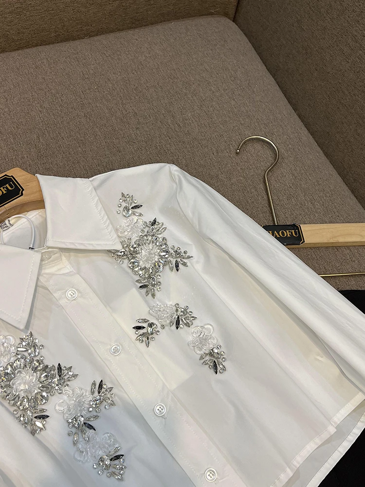 Chemises courtes à simple boutonnage pour femmes, luxueuses, avec strass, col rabattu, manches longues