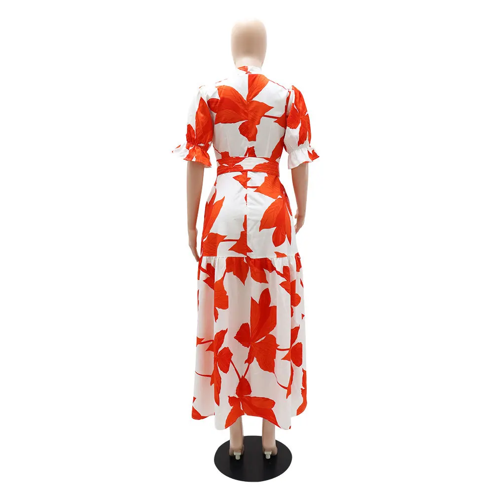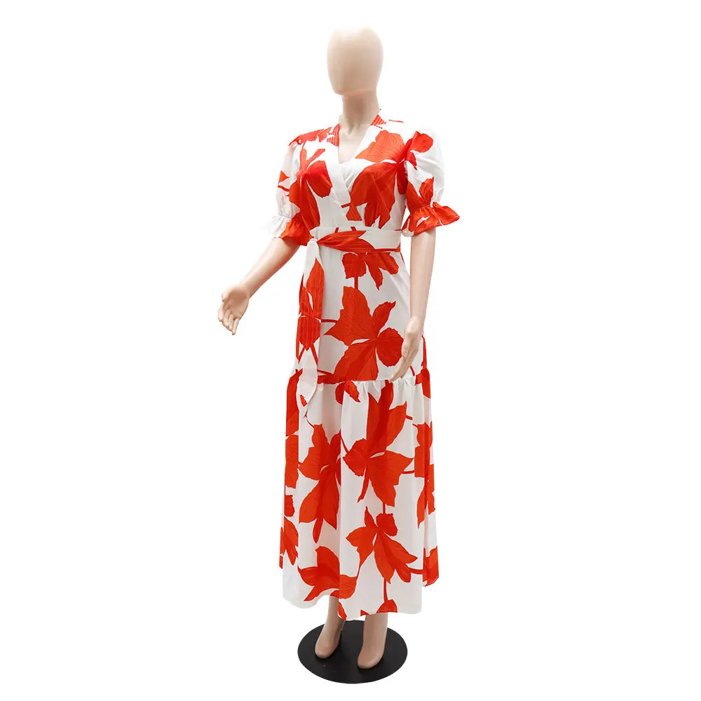 Robe d'été bohème pour femmes, design dernier cri, col en V, manches bouffantes, imprimé feuilles, longue, robes décontractées pour femmes