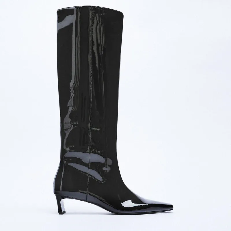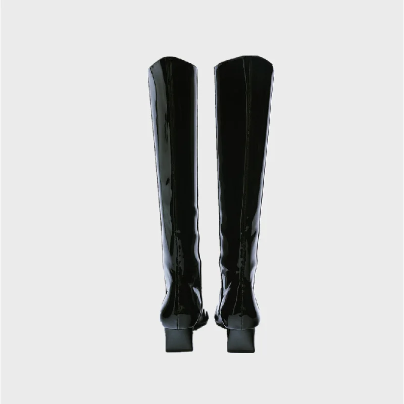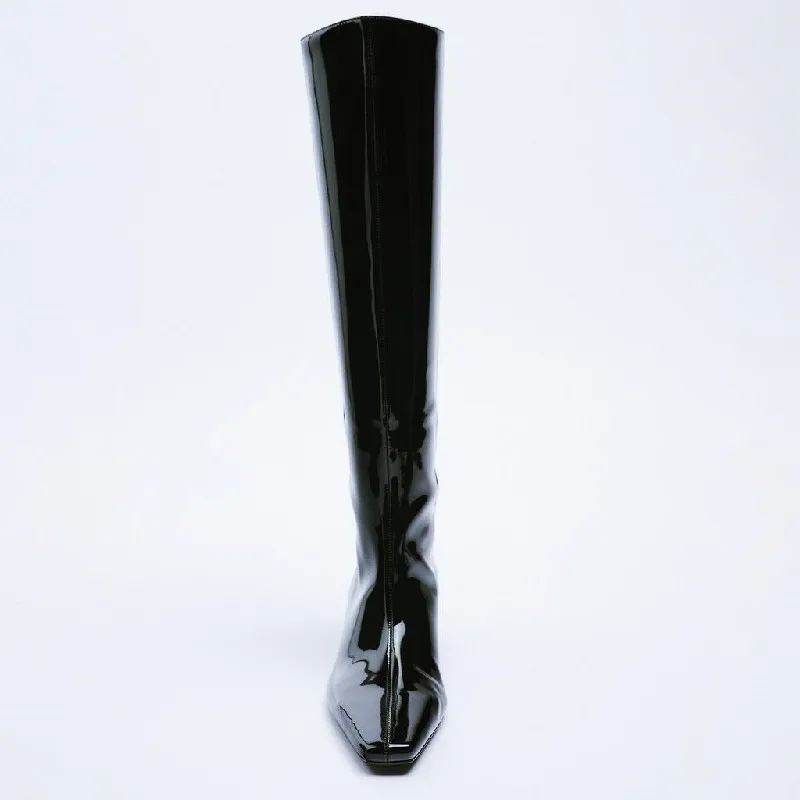 Bottes longues : Bottes de chevalier hautes pour femmes en cuir verni à petite tête carrée, talons hauts épais, bottes fines