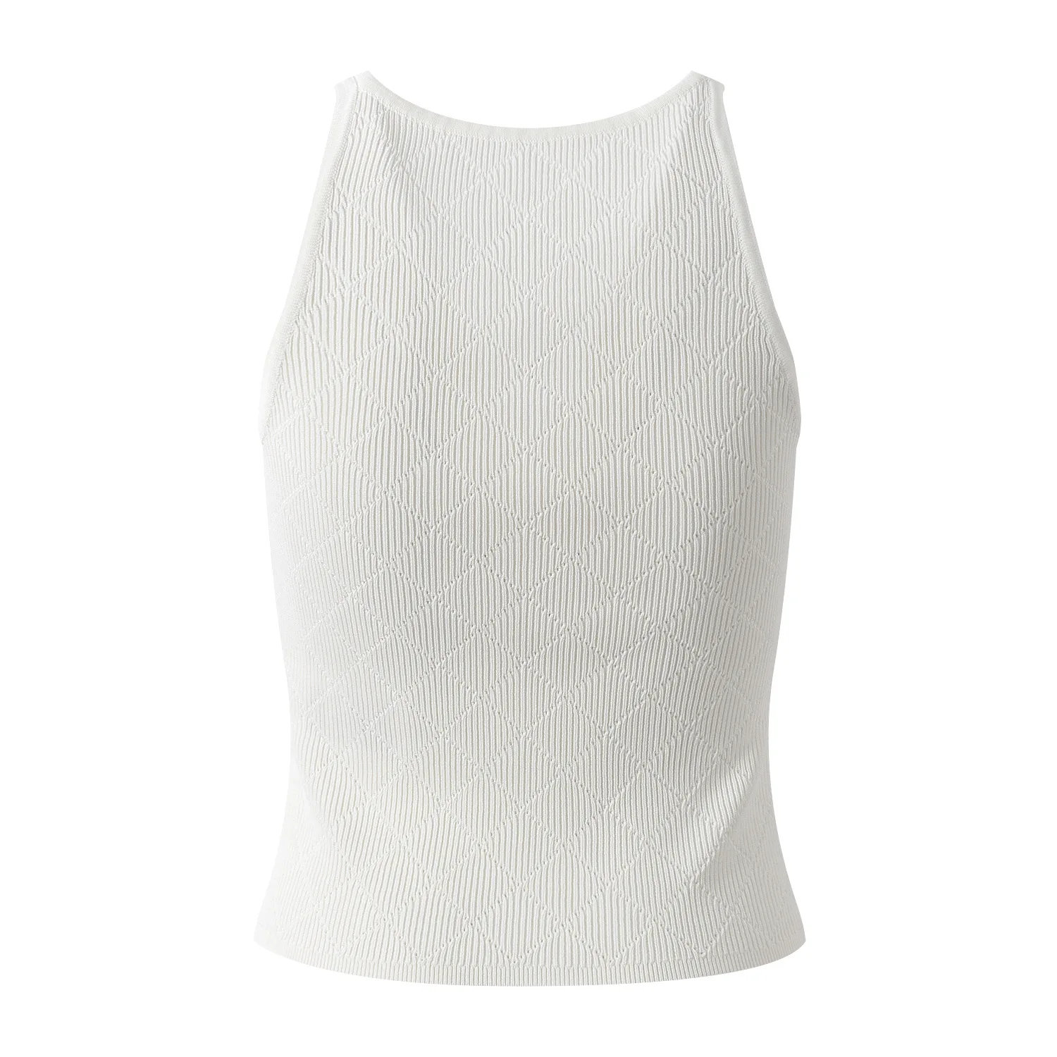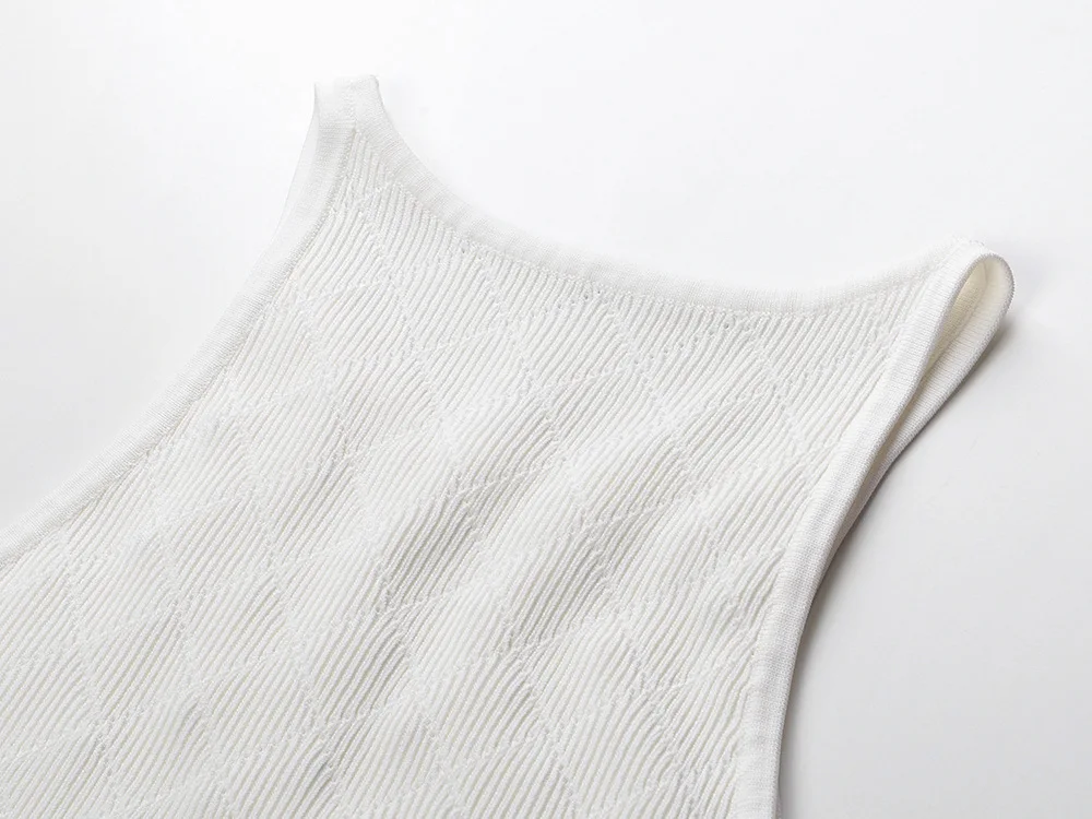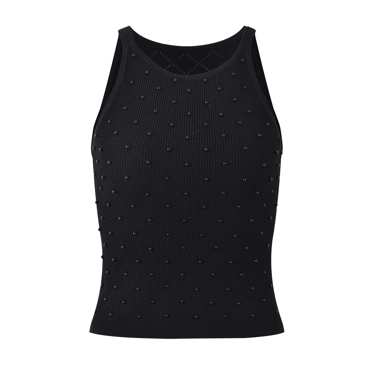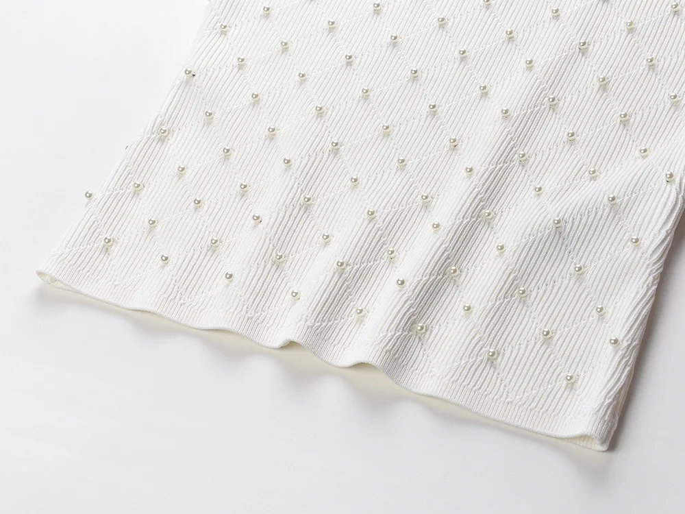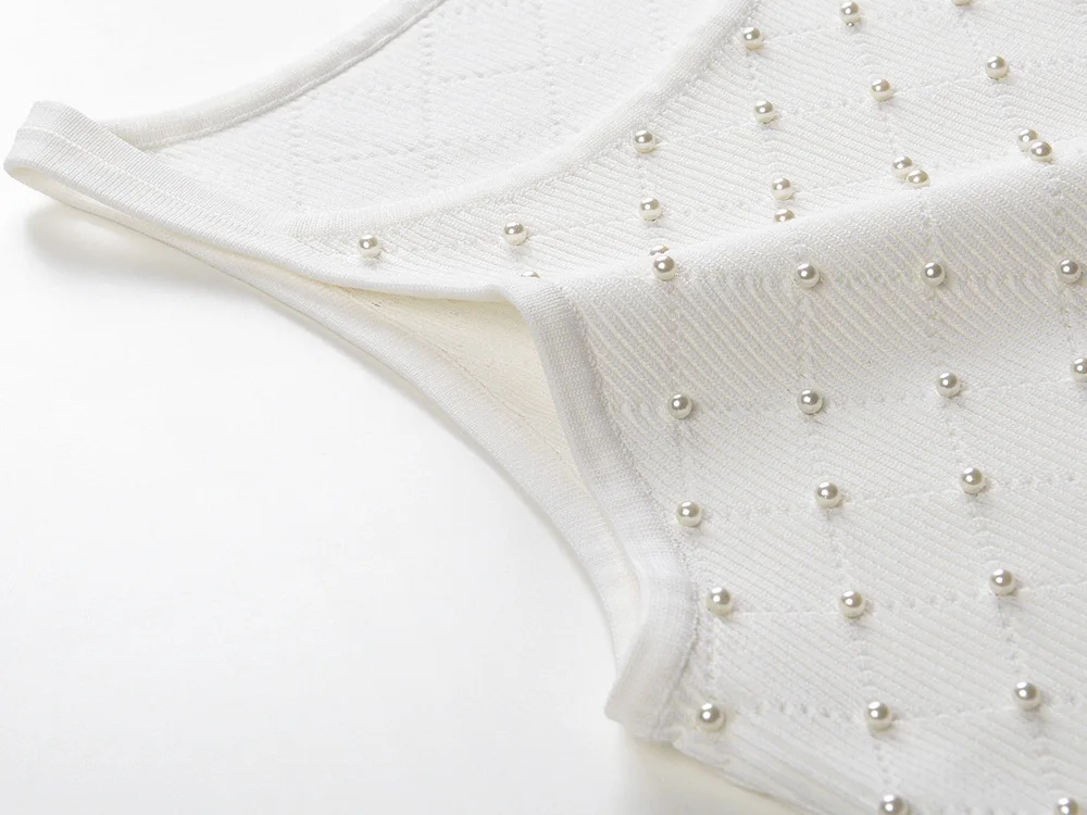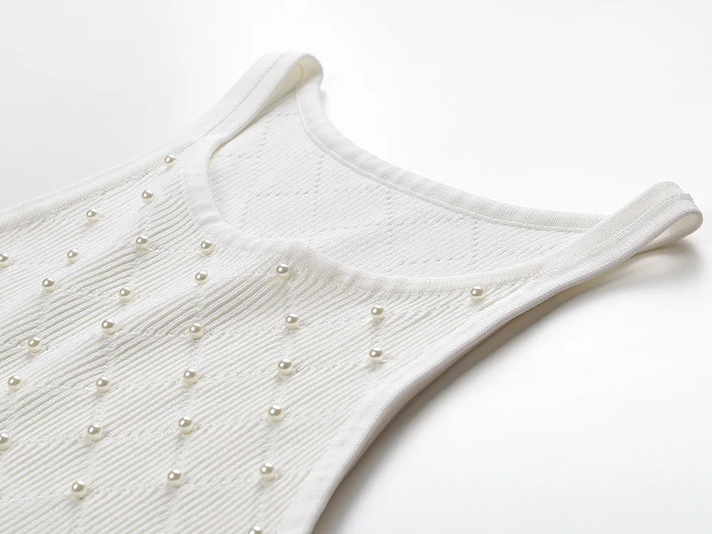 Nouveauté 2024 Été Dame Belle Fabrication Perles Col Rond Hauts Sans Manches Femmes Pull Mince Solide Tricots Chemises