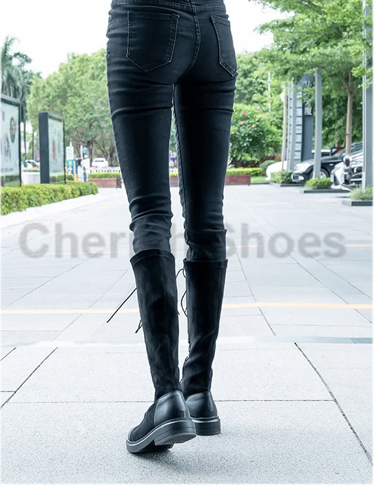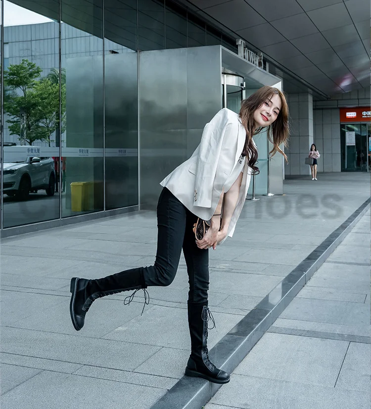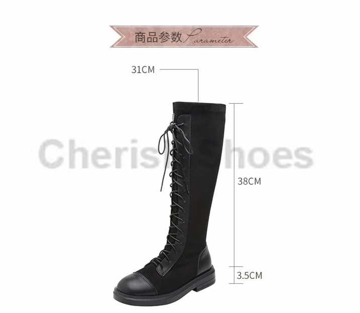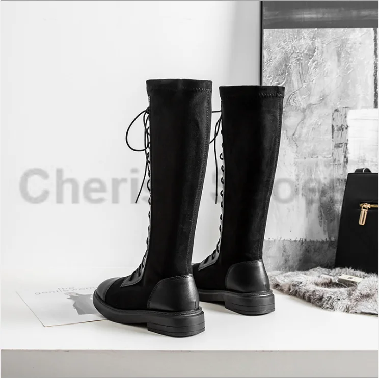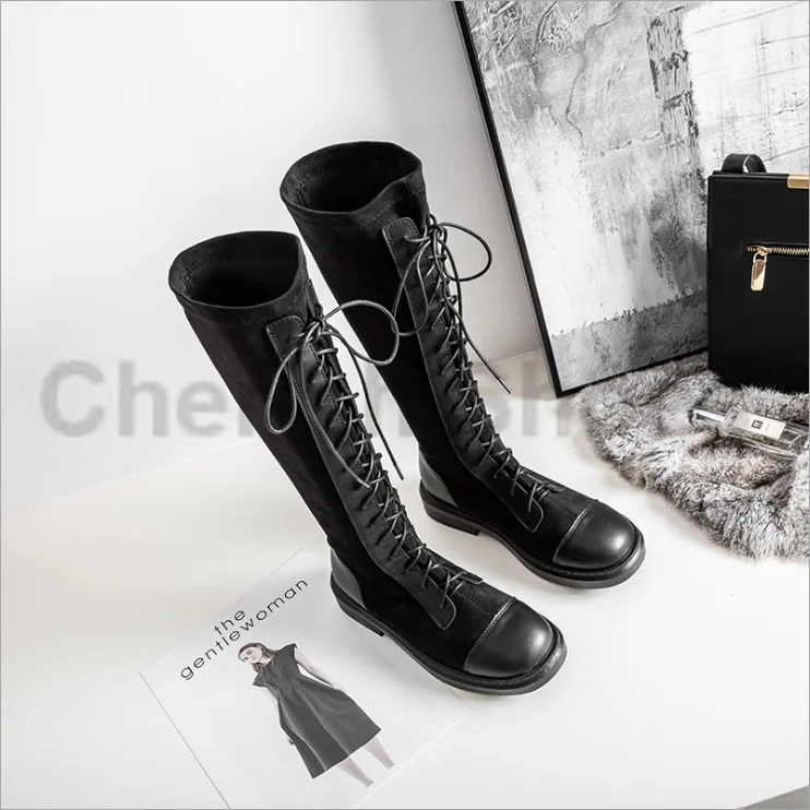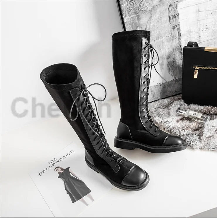 Nouvelle arrivée dernière conception chaussette bottes matériau extensible bout rond bloc genou bottes hautes pour l'hiver détail à lacets noir cool mode