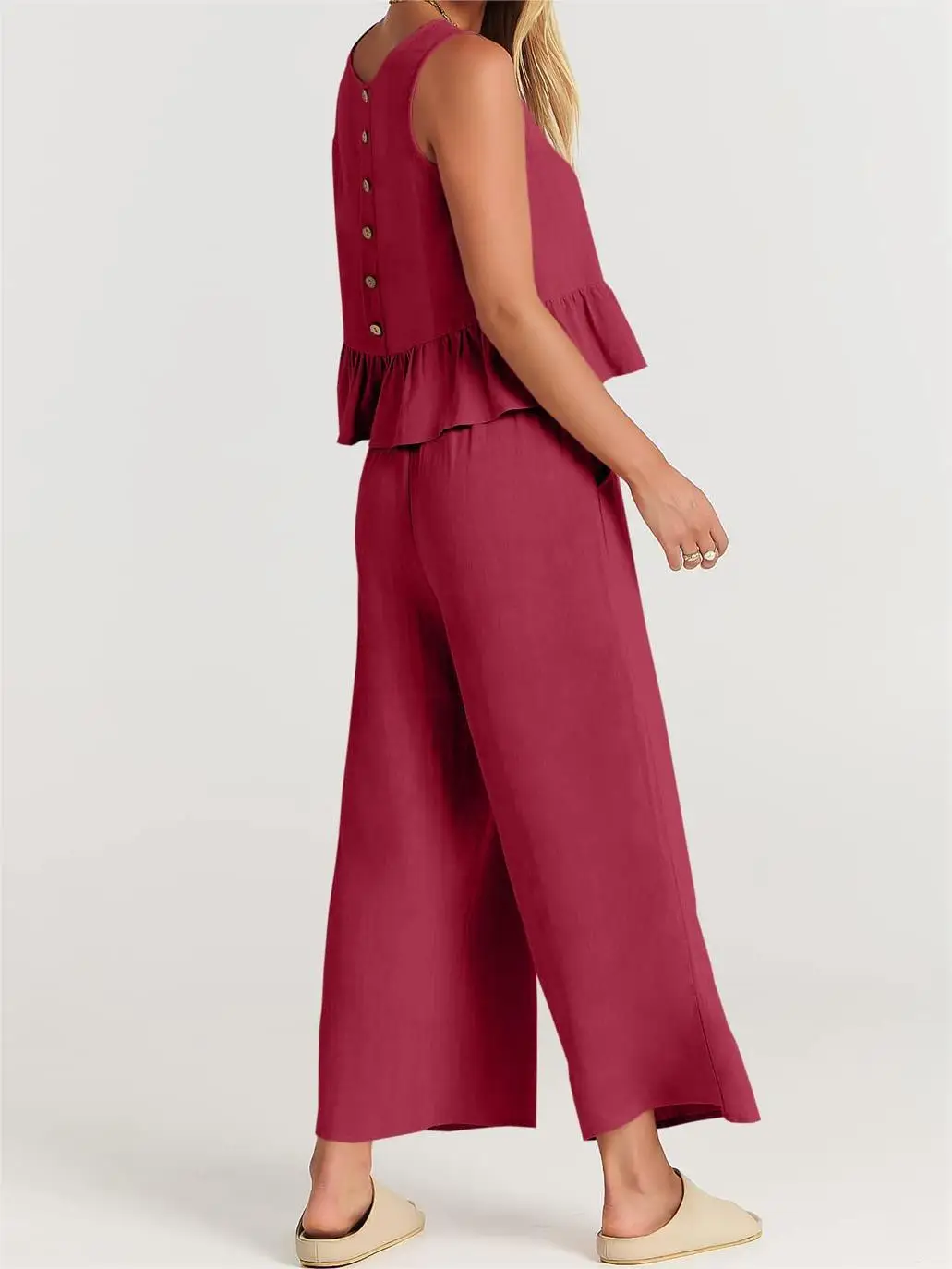 Nouvelle mode femme été sans manches chemise plissée pantalon large costume décontracté haut + pantalon deux pièces costume décontracté