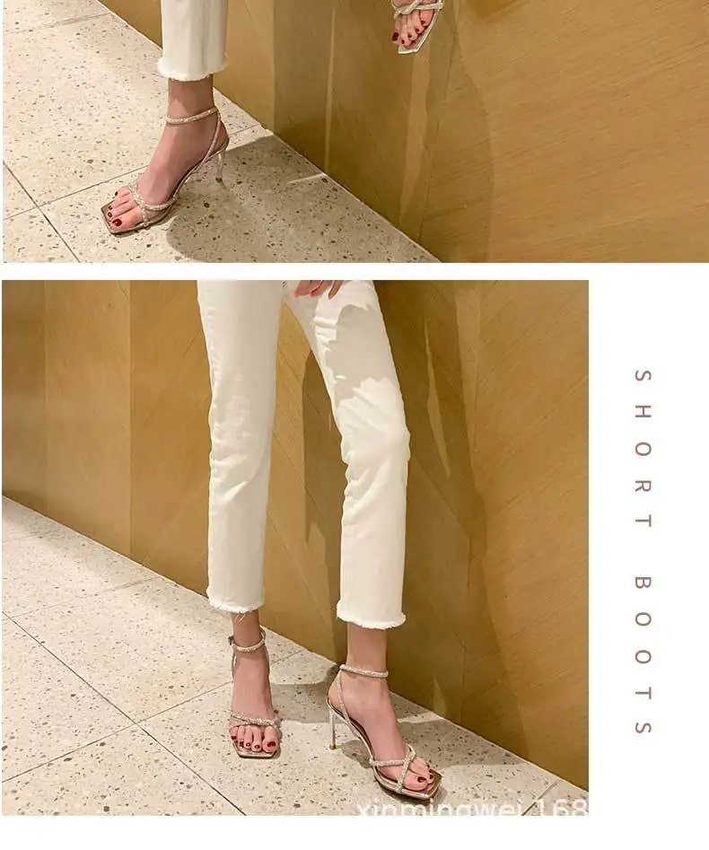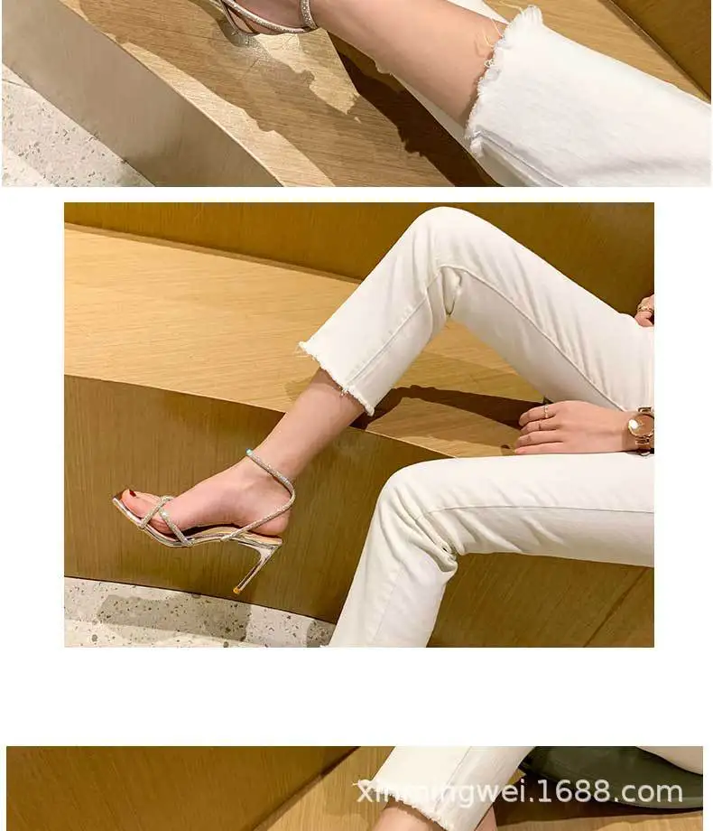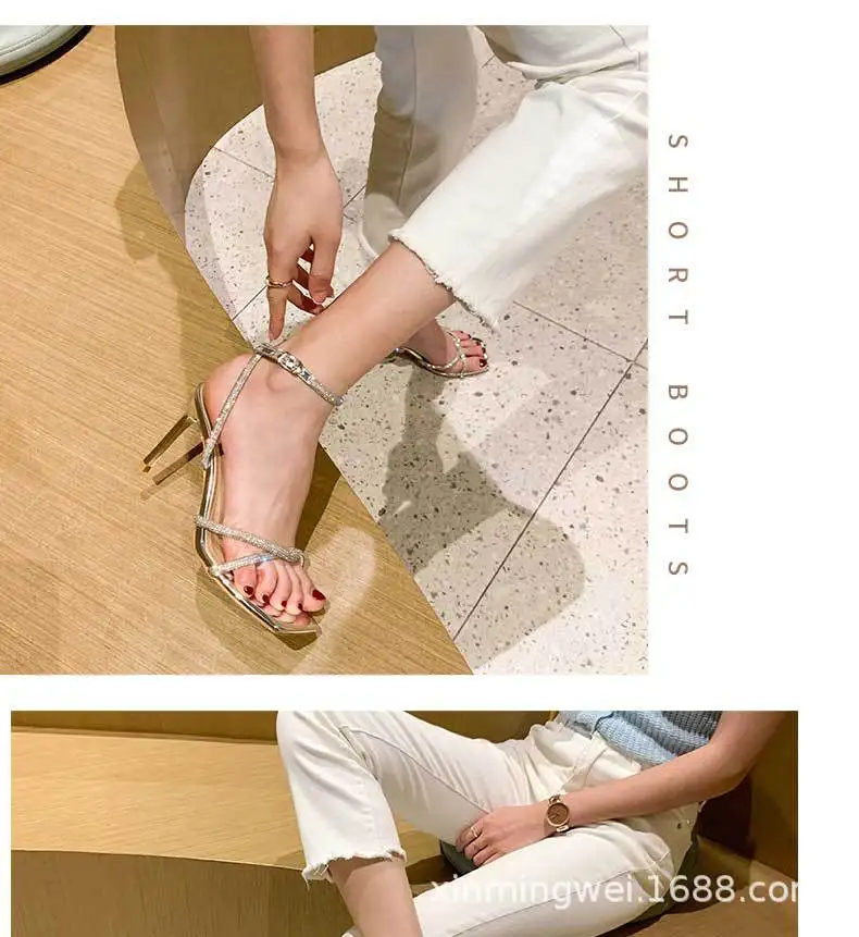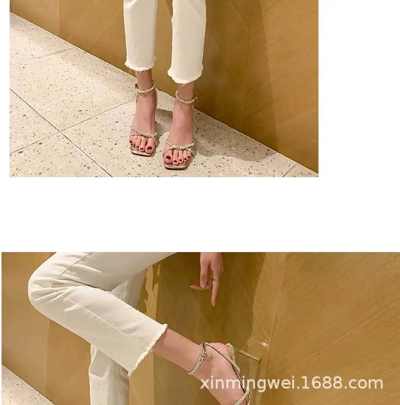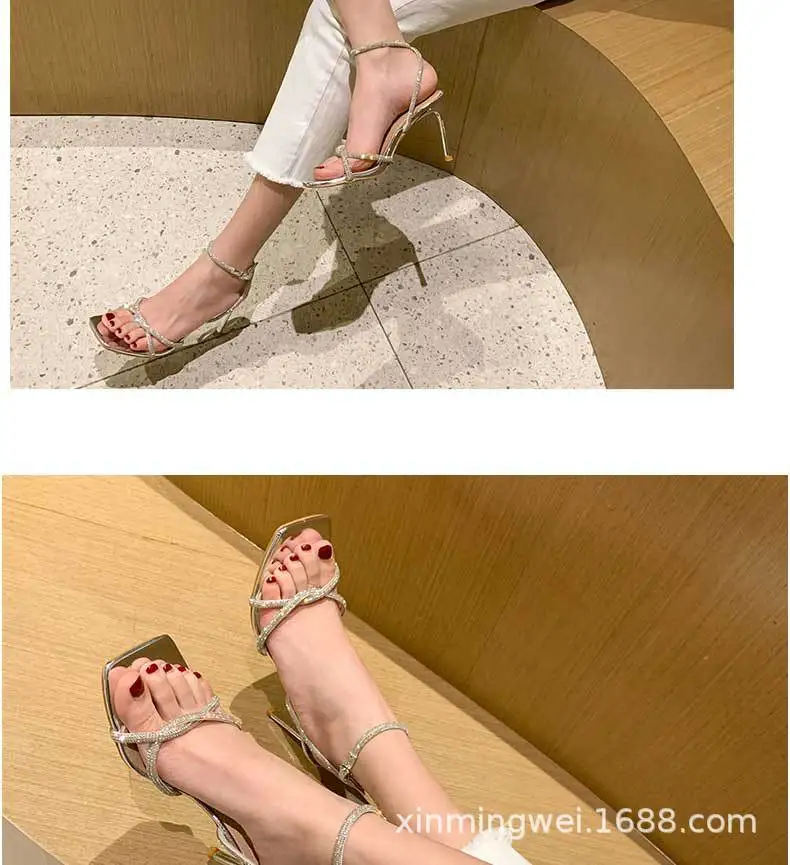 Nouvelles sandales à talons hauts pour femmes, bout carré, bride argentée, strass, sexy, ajourées, boucle de cheville