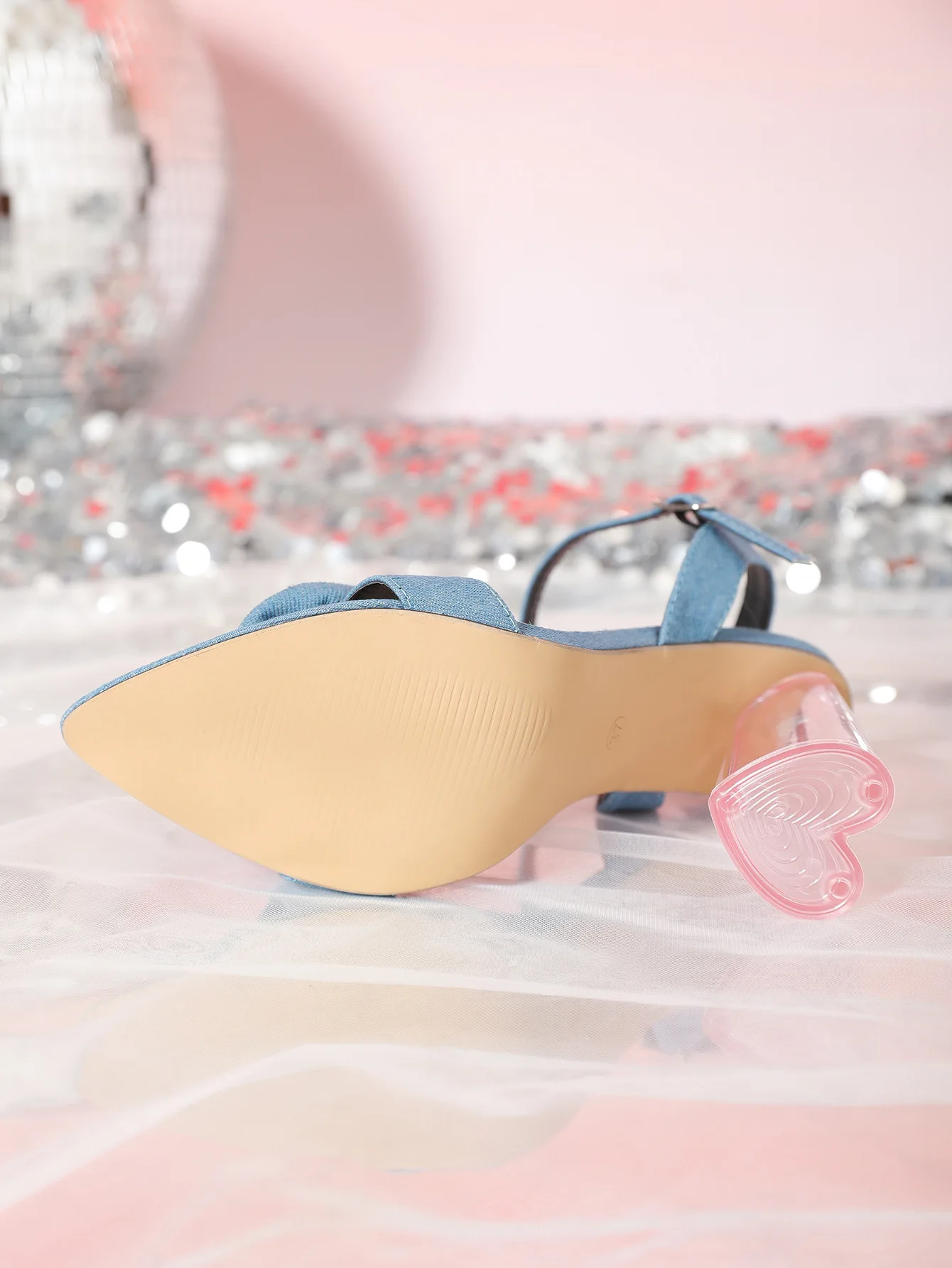 Nouvelles sandales à talons transparents pour femmes, escarpins pointus à talons hauts, motif floral en denim, talons hauts pour femmes
