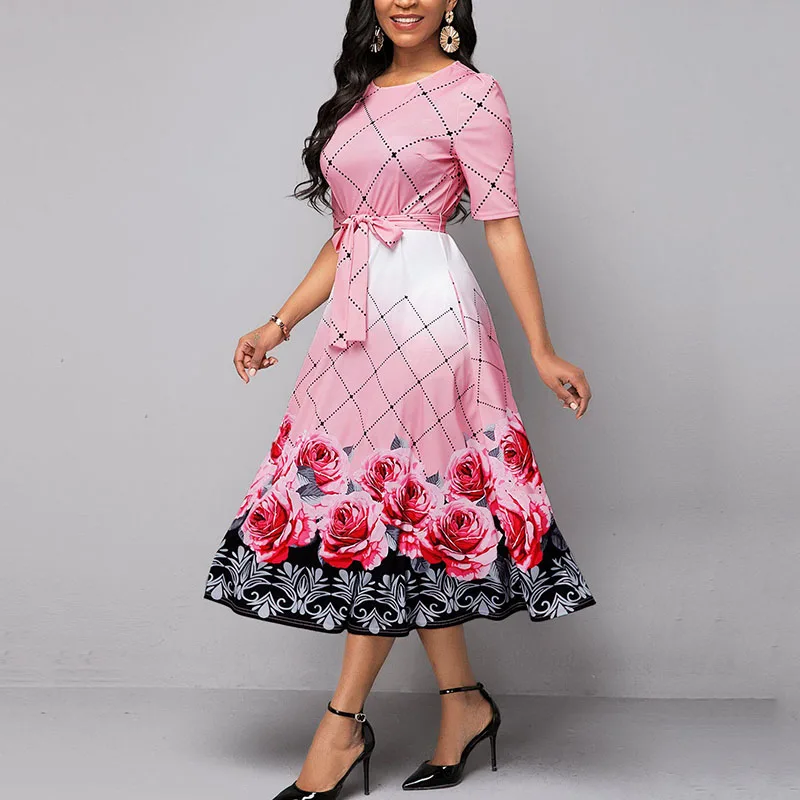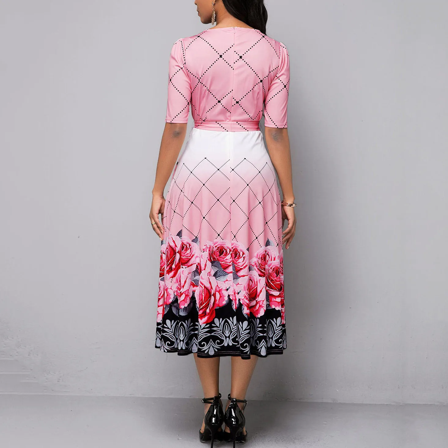 Robes de soirée pour femmes 2023, robes à lacets à imprimé floral, élégantes, roses, col rond, manches mi-longues, robe de soirée longue