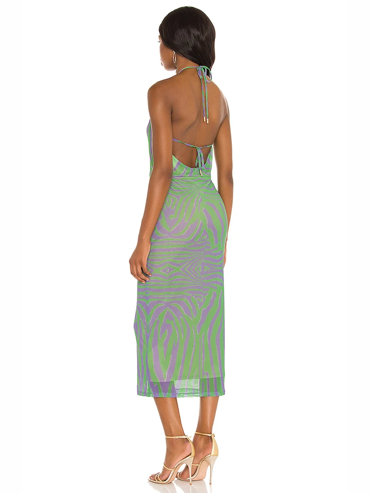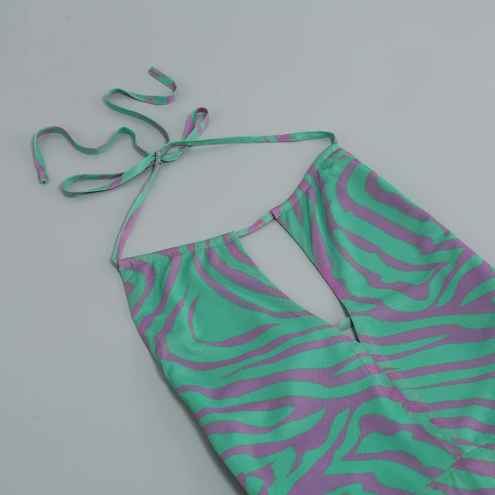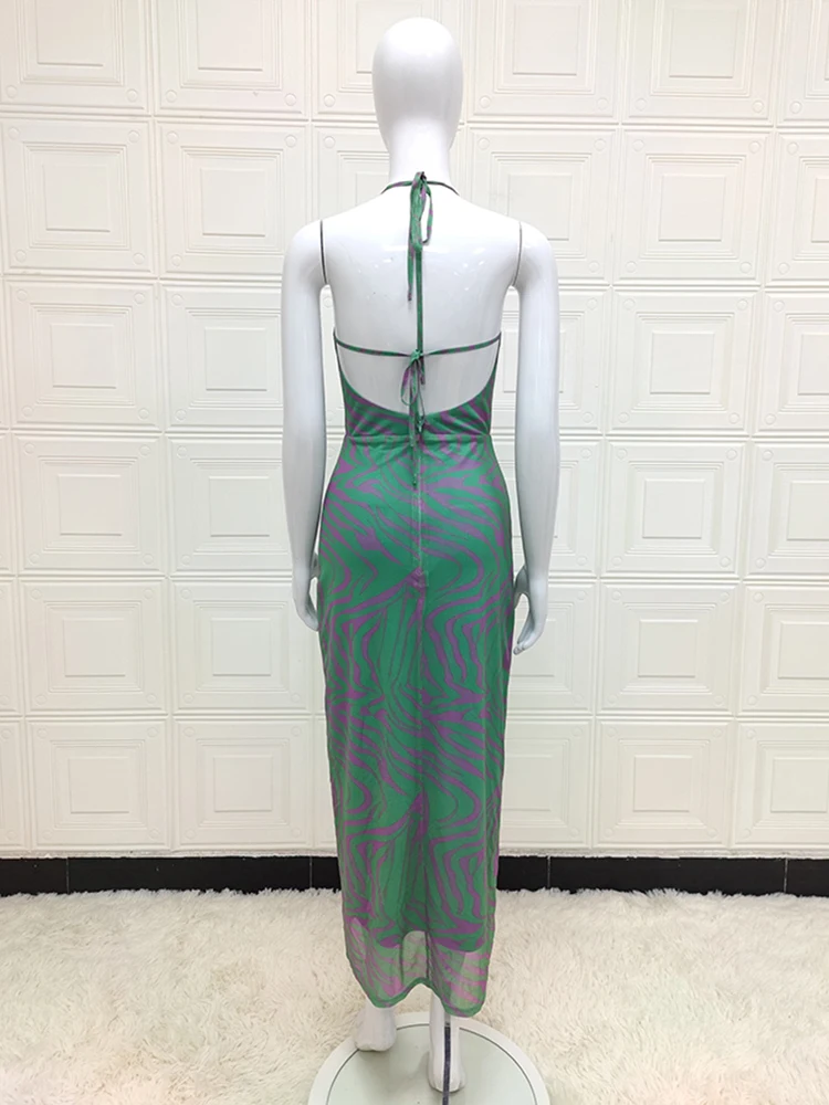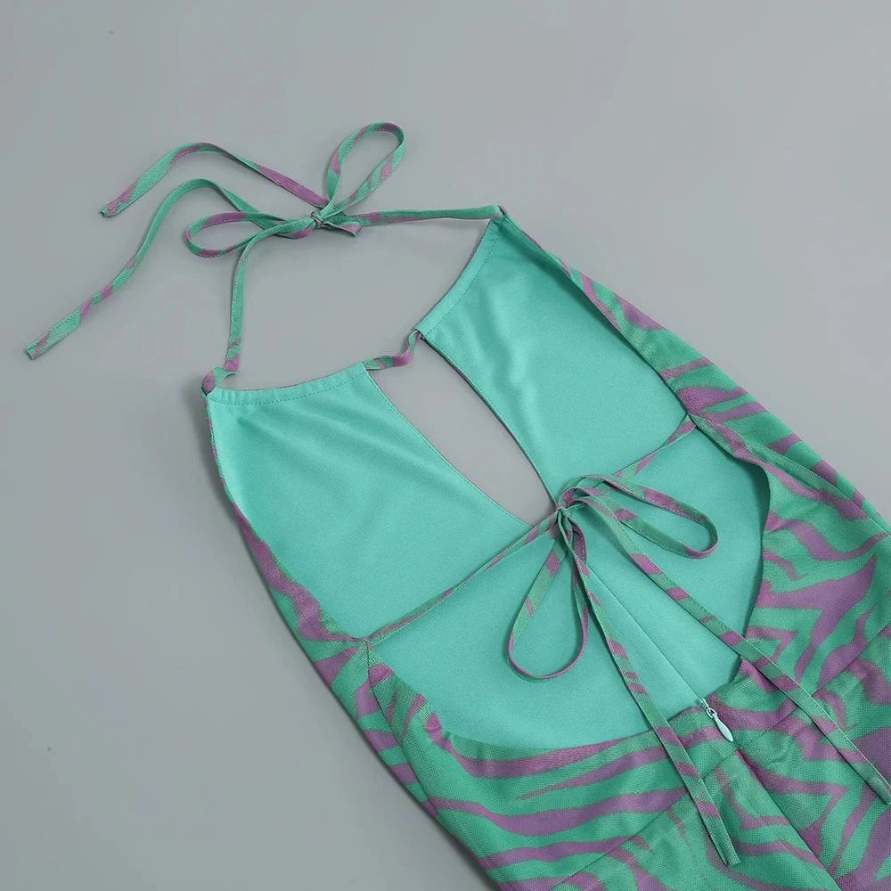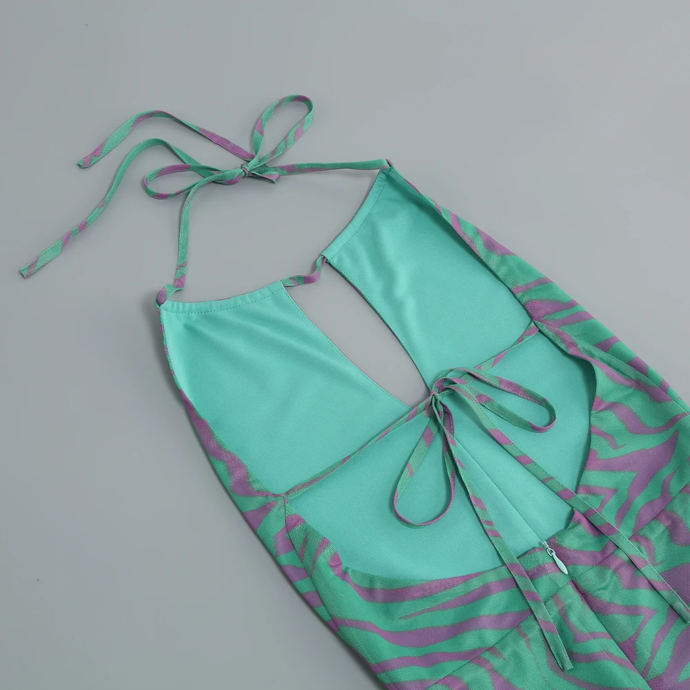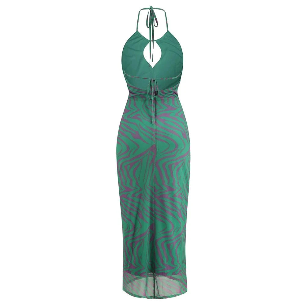 Hey, fashion - forward ladies! 😍 Check out this show - stopping halter - neck midi dress! The fabric is a high - quality blend that offers a smooth, comfortable fit while maintaining a sleek silhouette. The vibrant green with purple abstract stripes is a bold and eye - catching combination, ensuring you'll stand out in any crowd.
