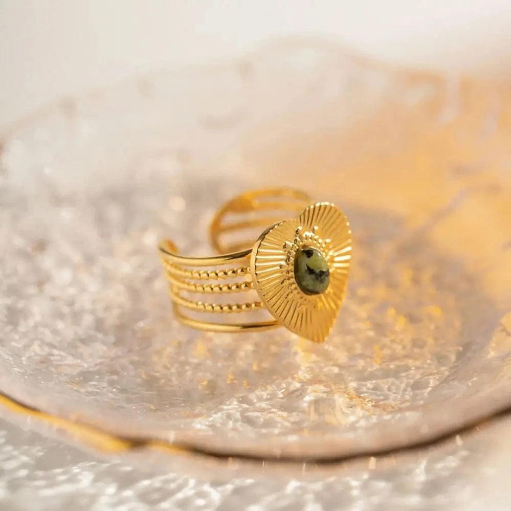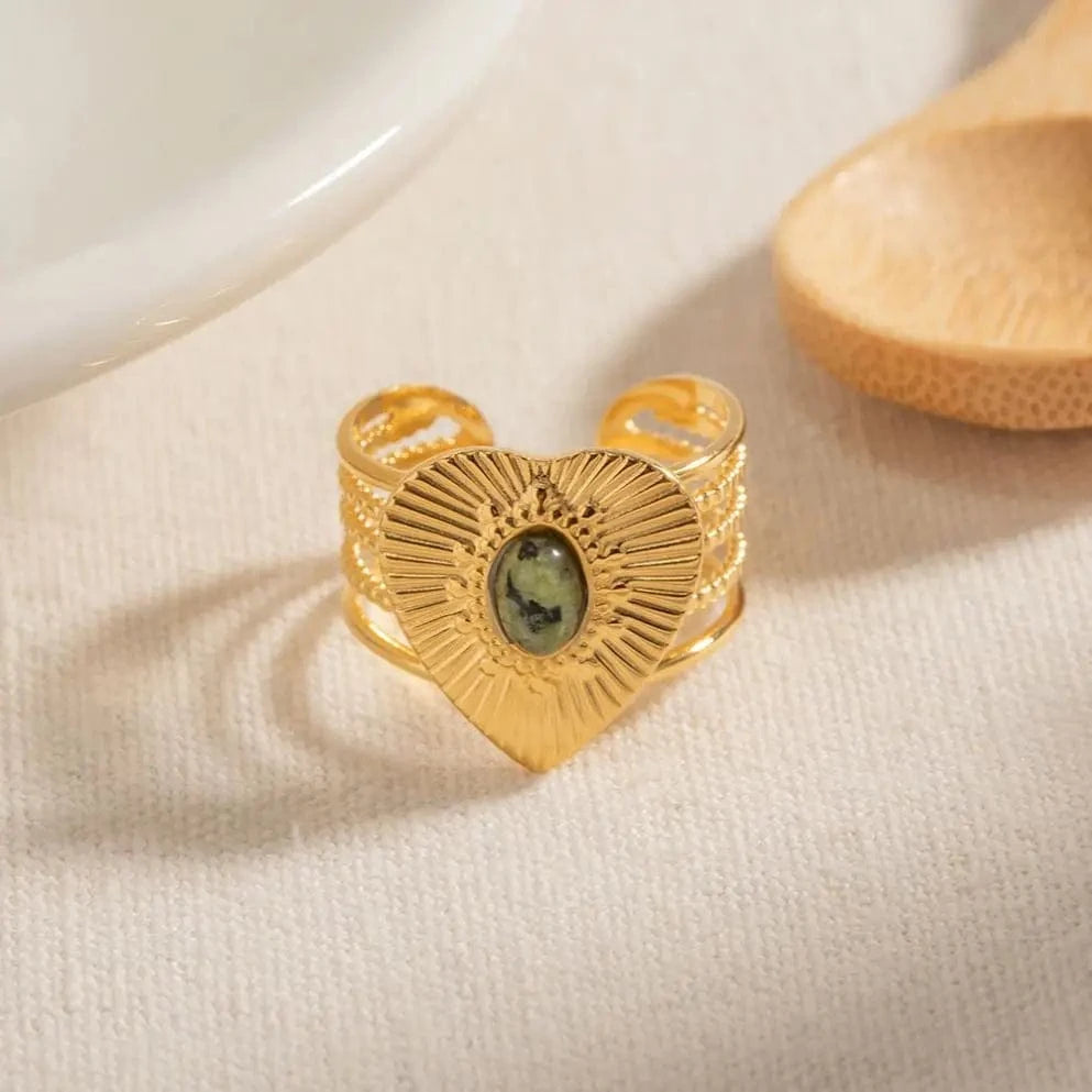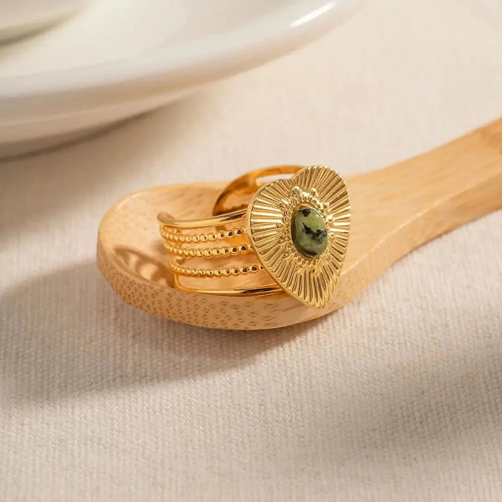 Bague ouverte en acier inoxydable plaqué or 18 carats R1945, cadeau, texture multicouche, pierre naturelle africaine, cœur