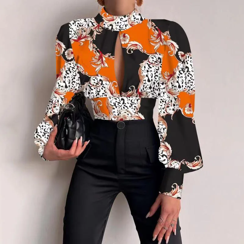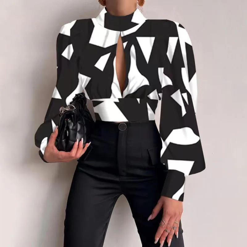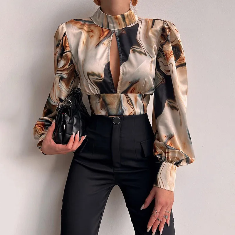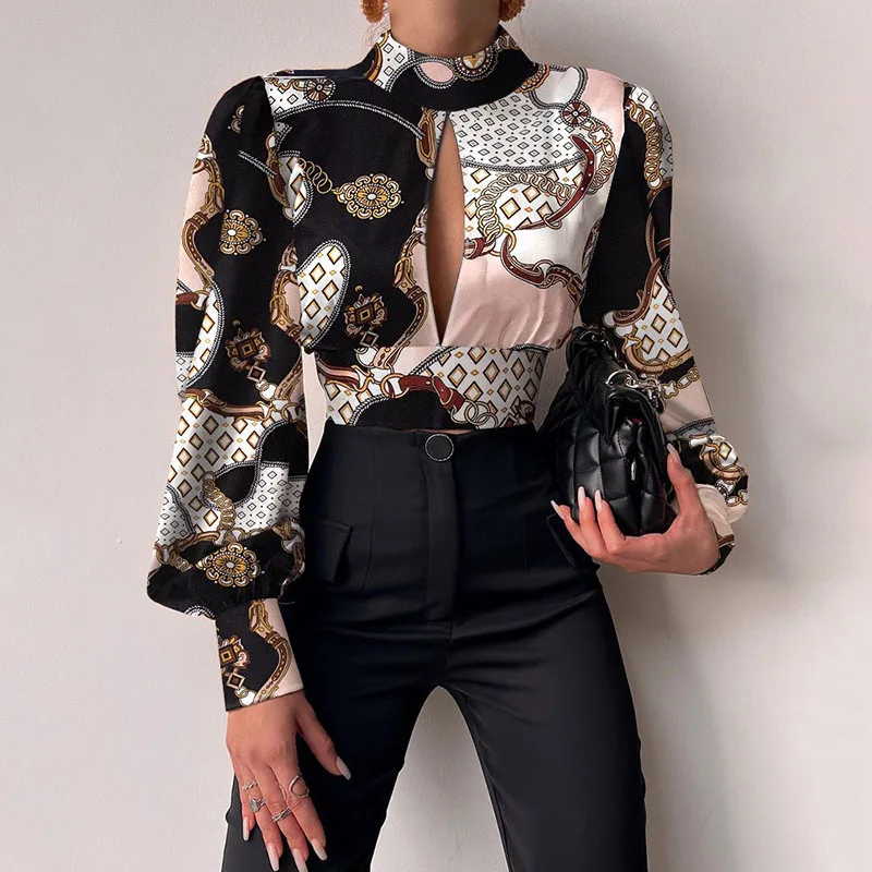 RNSHANGER Femmes Sexy Dos Nu Creux Imprimé Chemises Mode Fête Crop Top Printemps Décontracté Stand Manches Longues Bureau Dame Chemisiers