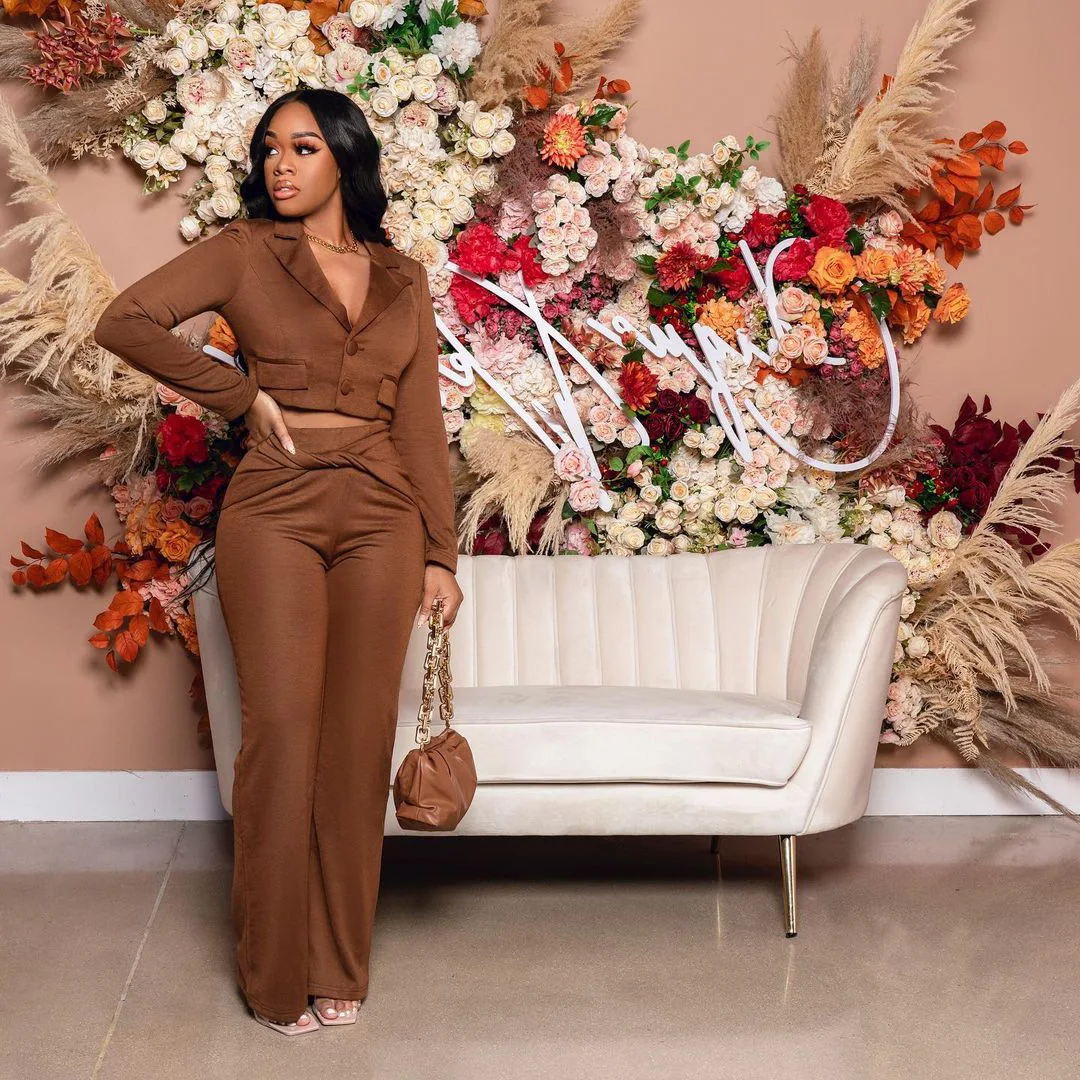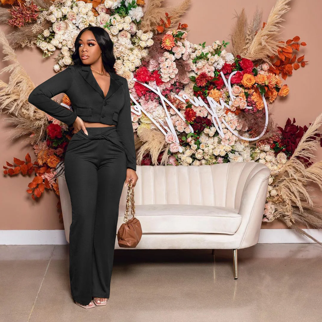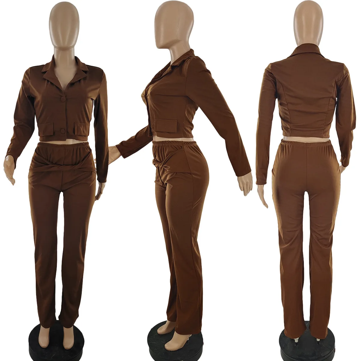 S90089 ensemble deux pièces pantalon femme longue section revers de couleur unie avec boutons haut pantalon ample street femmes vêtements d'automne