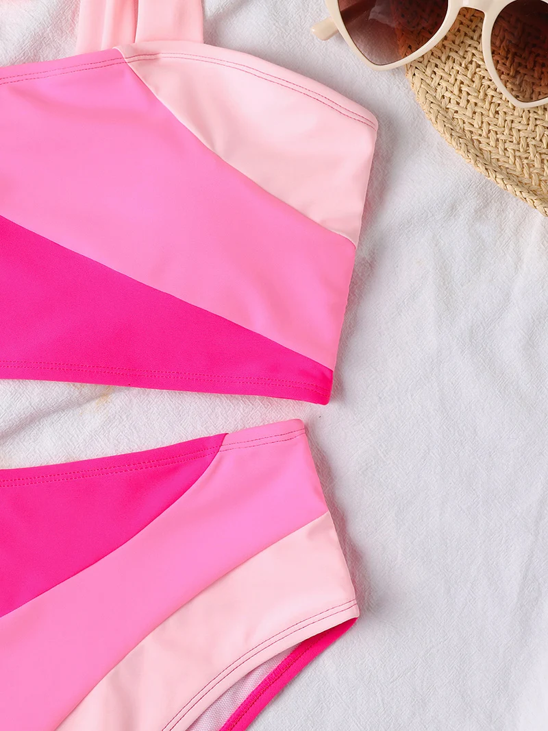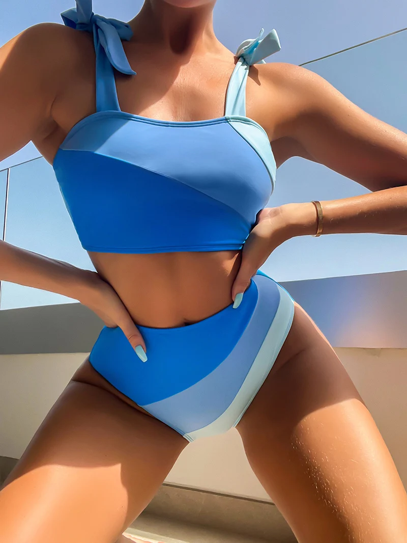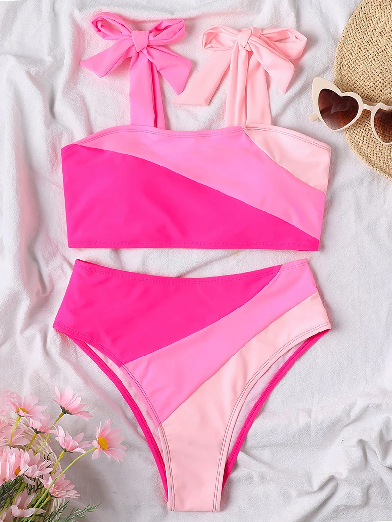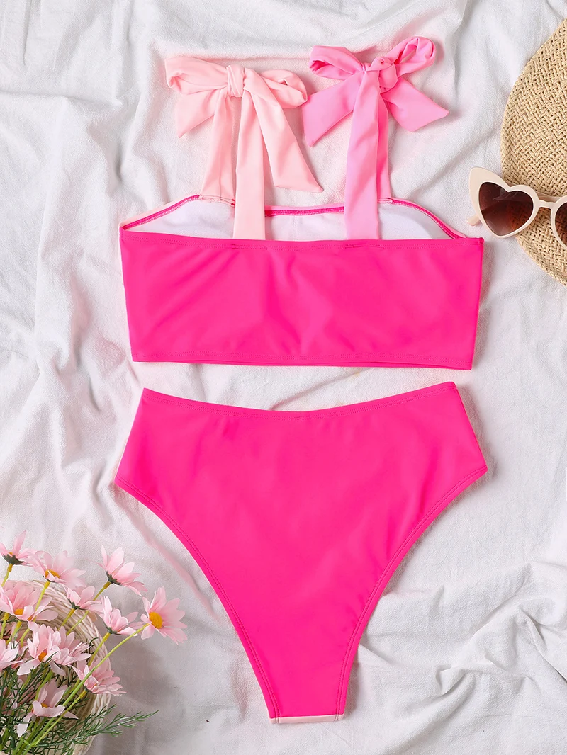Maillot de bain deux pièces sexy rose vif dégradé, taille haute, noué, pour femme, bikini, pour la plage et l'été, 2024