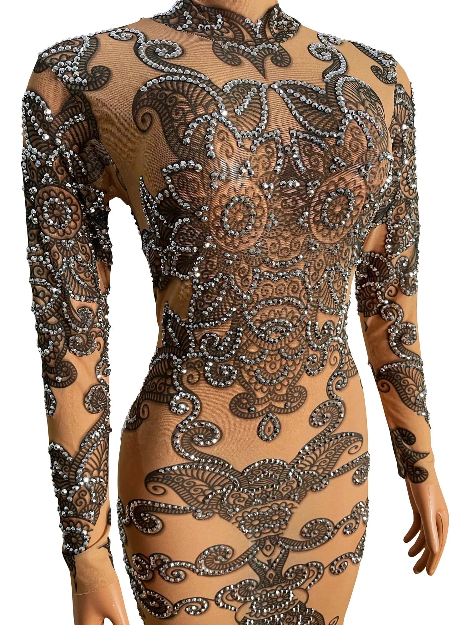 Robe de soirée sexy à manches longues en maille, motif floral et strass, tenue de mariage, moulante, maxi, pour fête d'anniversaire, bal, 2022